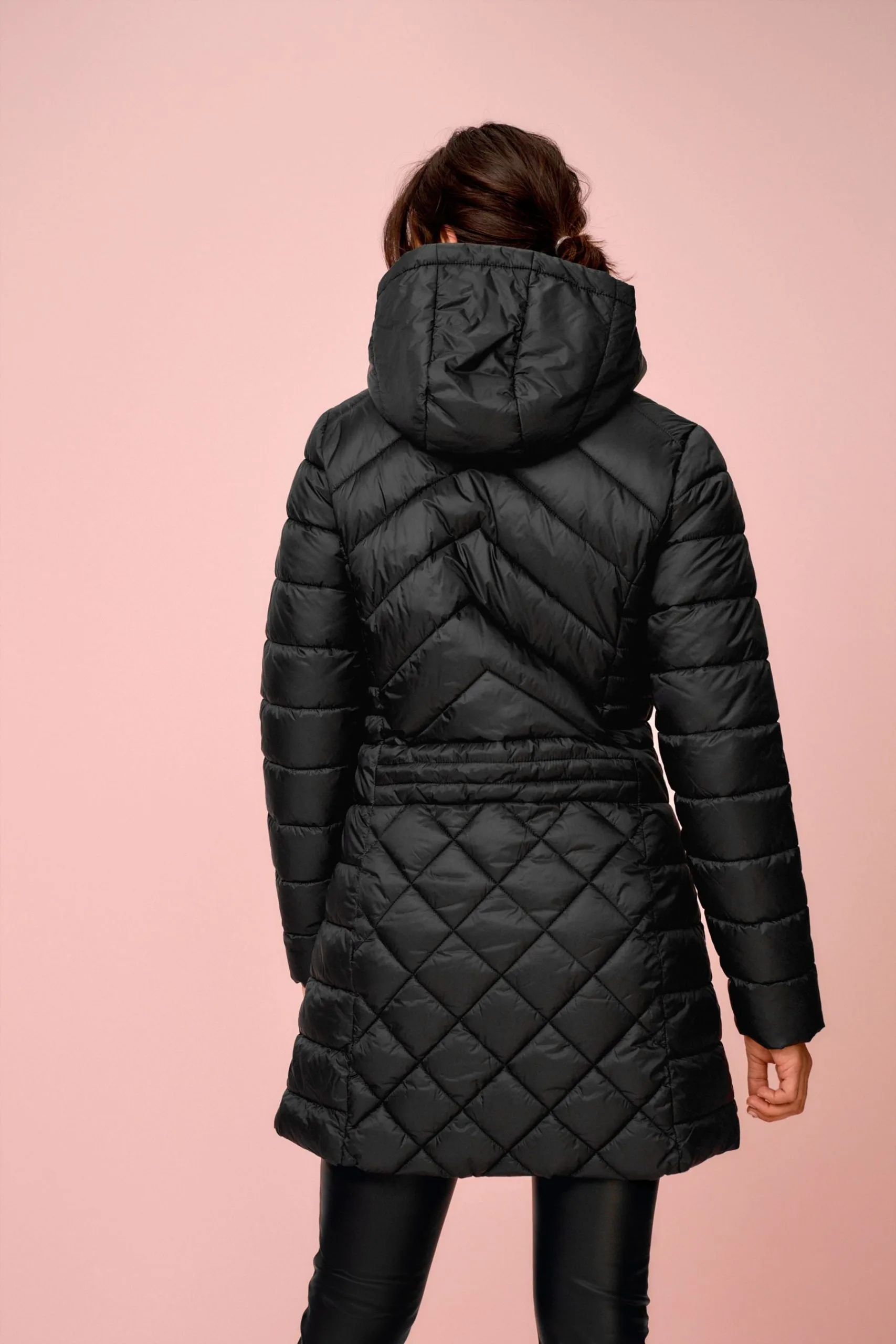 The search for your perfect cosy winter jacket is over as this black padded longline coat is ideal for all your cold weather needs. Whether popping to the shops or a long winter's day stroll, this coat will keep you feeling warm and snug while looking oh so stylish. Designed with chevron pattern detailing to the top and a fitted waist before flaring out to skim over your hips with diamond quilting to the lower half. Featuring zip and popper pockets, a zip-through fastening and large snuggly hood.