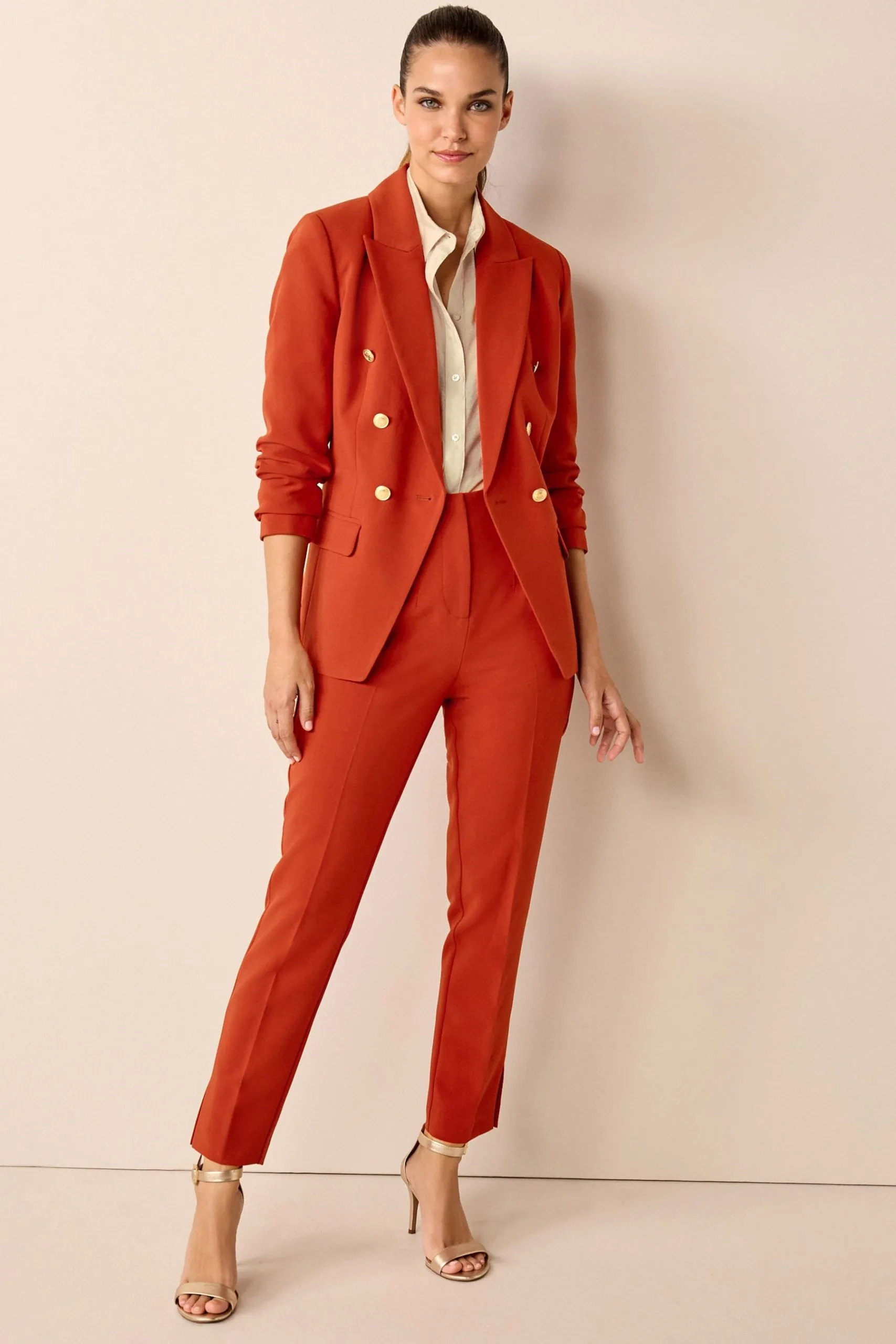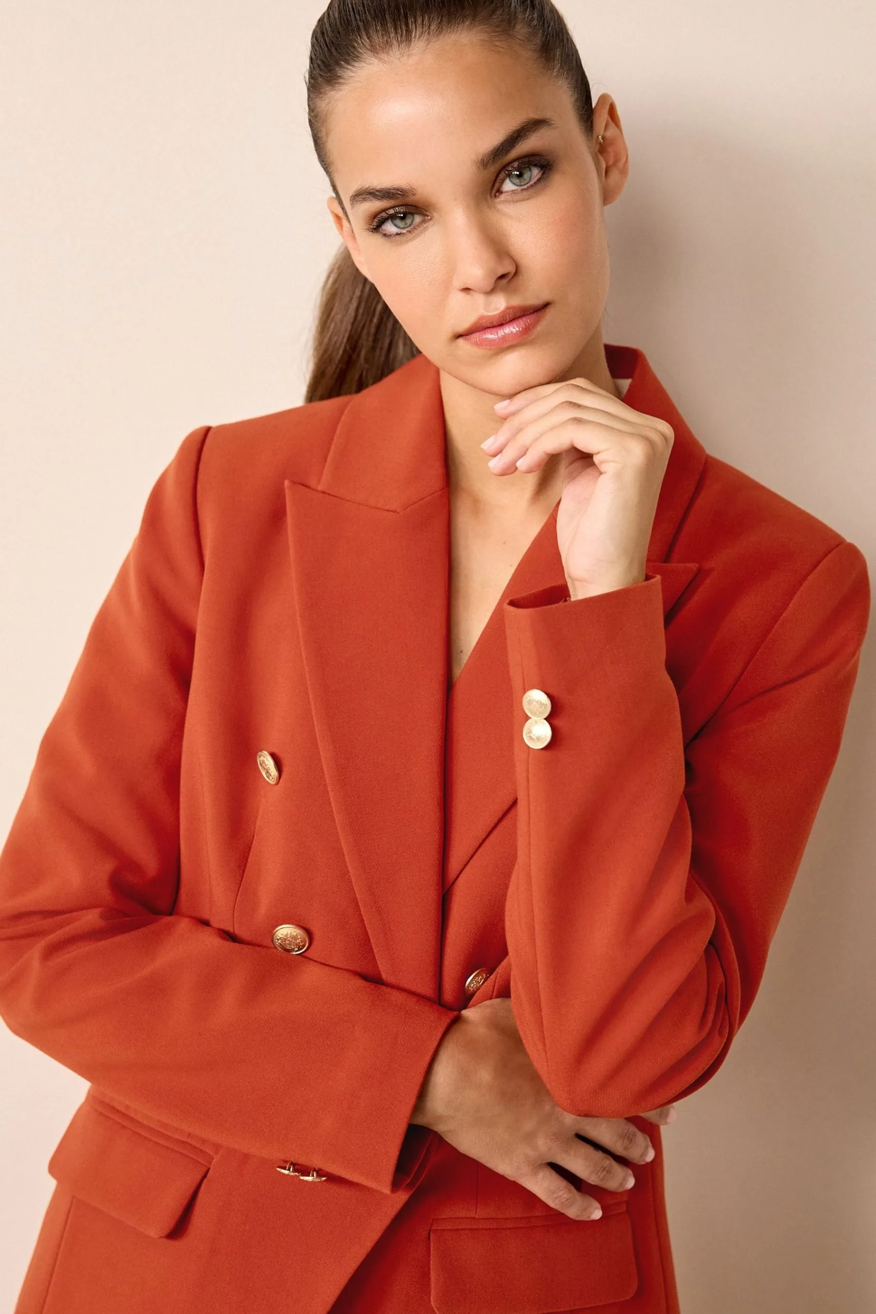 Pull together your favourite style staples with our stunning button detail double breasted blazer in rust brown.