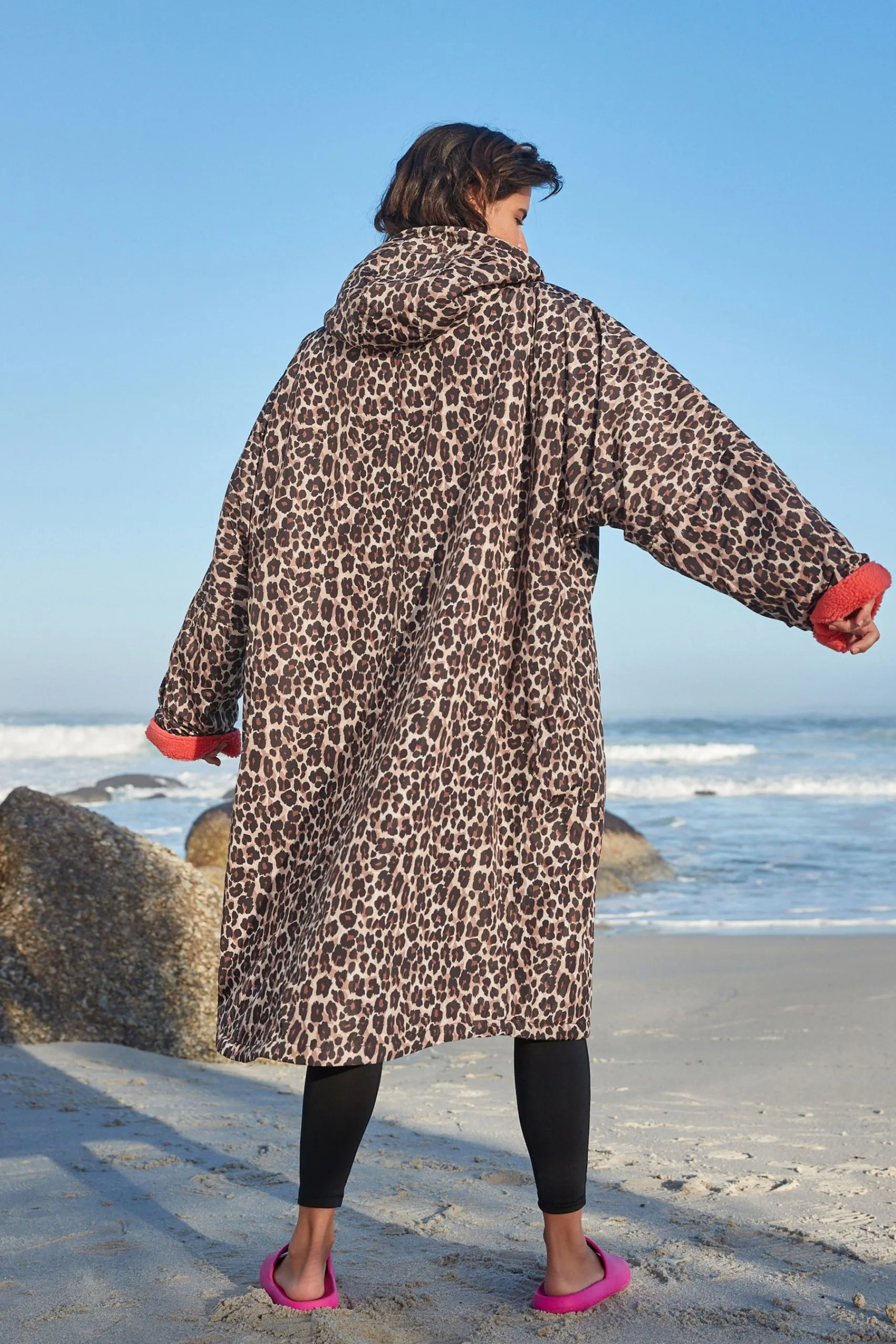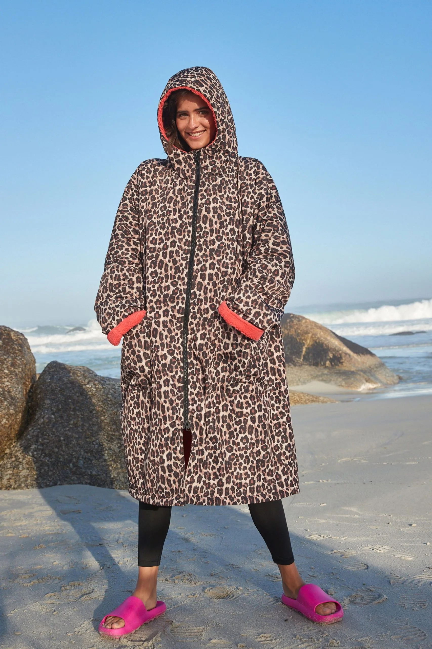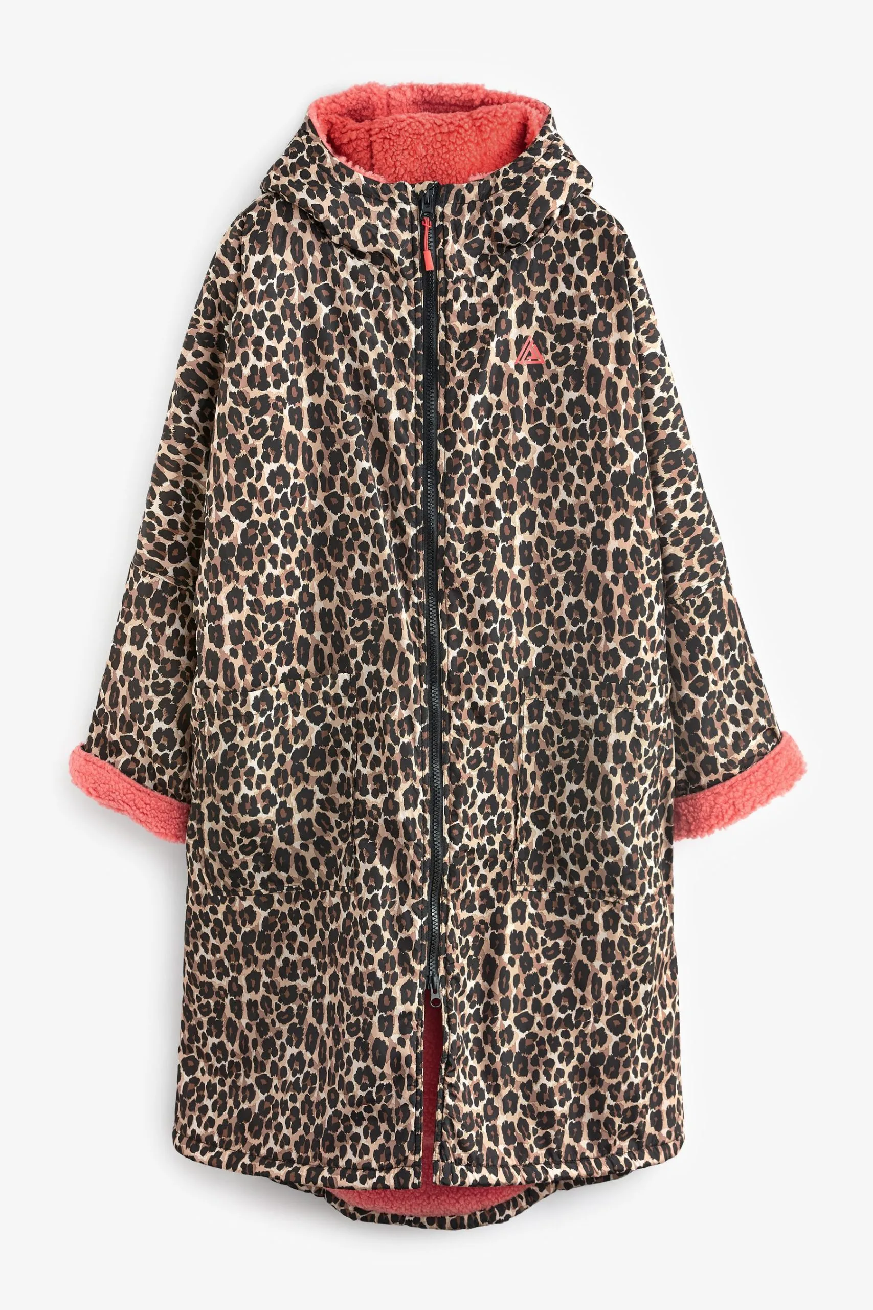 This animal print coat is designed to keep you warm and dry for discreet changing outdoors, before and after water sports. Made in an oversized fit from breathable material that is also shower resistant. With a snuggly contrast fleece lining to keep you feeling toasty and a large cosy hood. Also featuring a front zip fastening, two large patch pockets and a zipped internal pocket.
