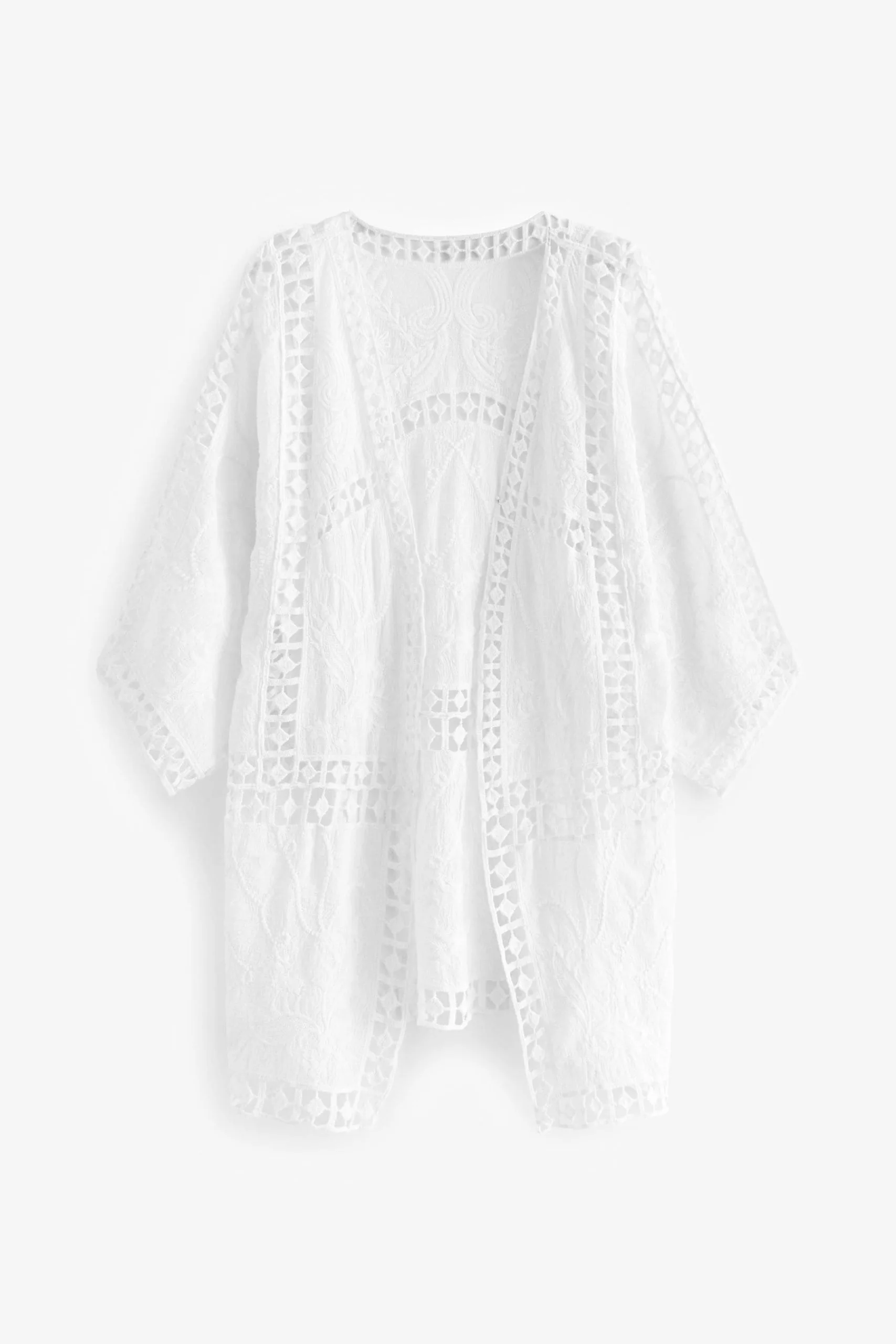 Hit the beach in style with our fashionable and functional crochet longline cover-up. Cutting a floaty silhouette, this charming classic cream piece boasts eye-catching cut-out detailing with a heavily embroidered finish for a premium look. Wear it with a simple swimsuit after a day on the beach and enjoy its versatility.