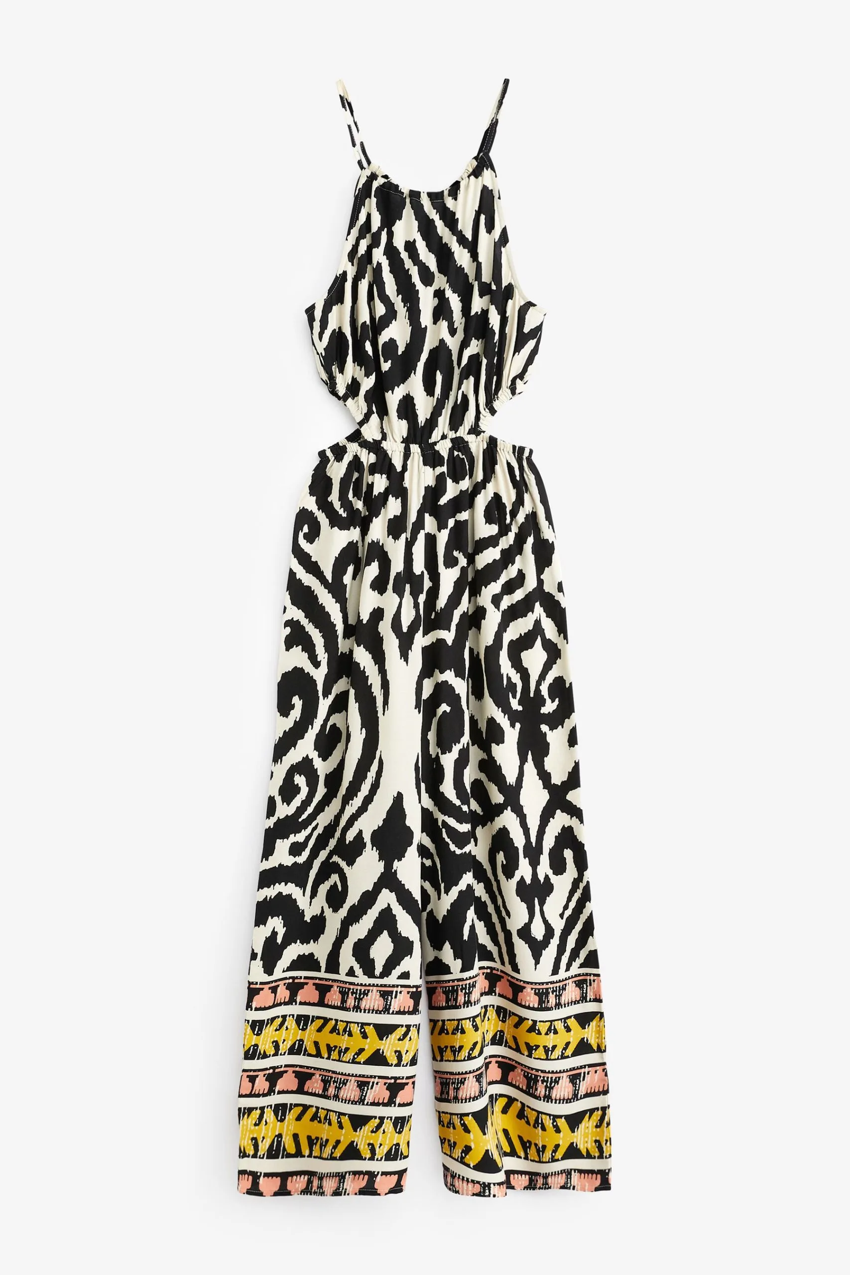 Top of the holiday hotlist is our cut-out jumpsuit. Taking you from beach to bar with ease, this is a style you most definitely want in your suitcase. Made in a soft and silky yet cool and comfortable viscose fabric in an abstract black and cream design with contrast patterned hems. Designed with halterneck spaghetti straps which tie at the back for an adjustable fit, an elasticated waistband with flattering cut-out detailing to the sides and 3/4 length wide-leg trousers.