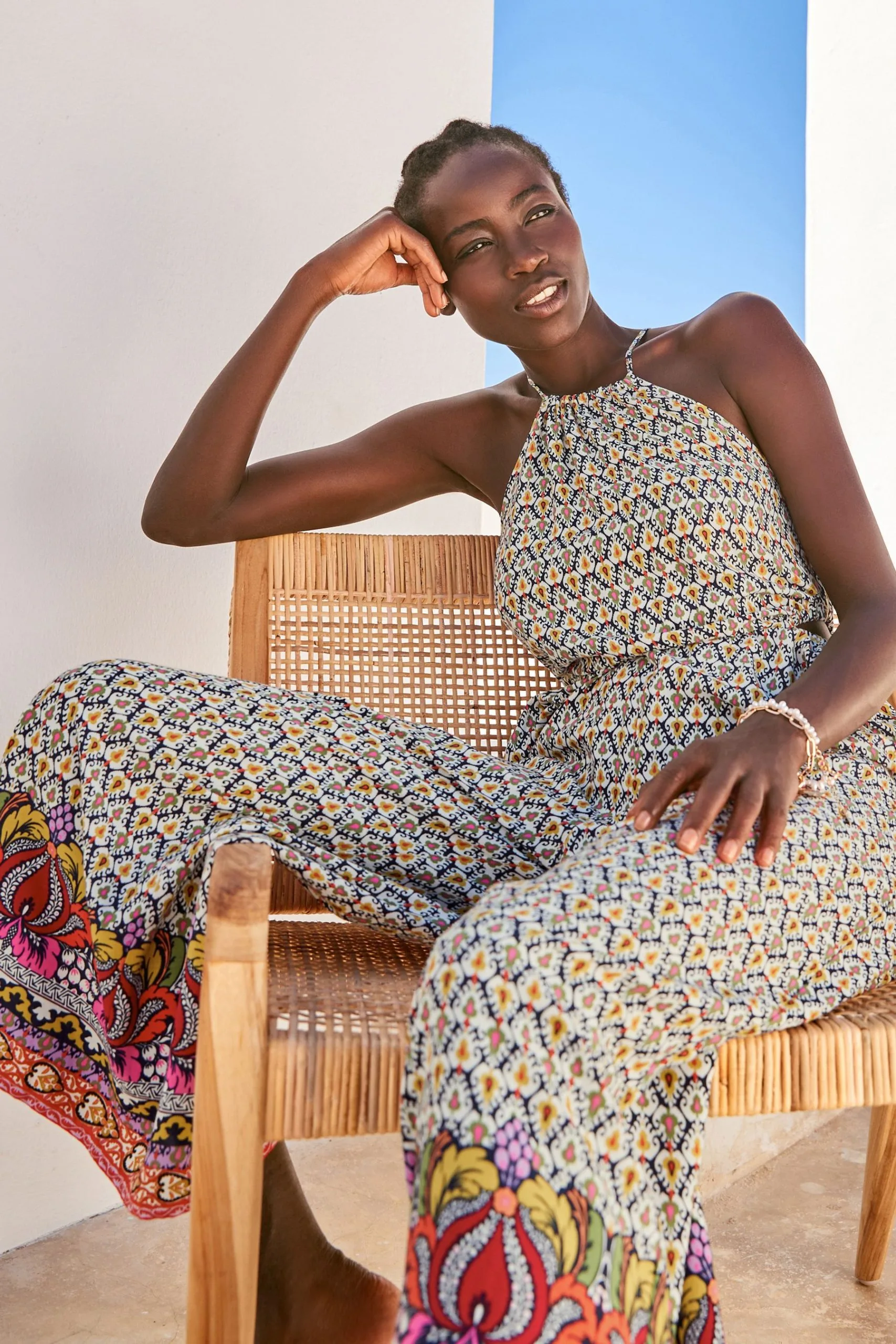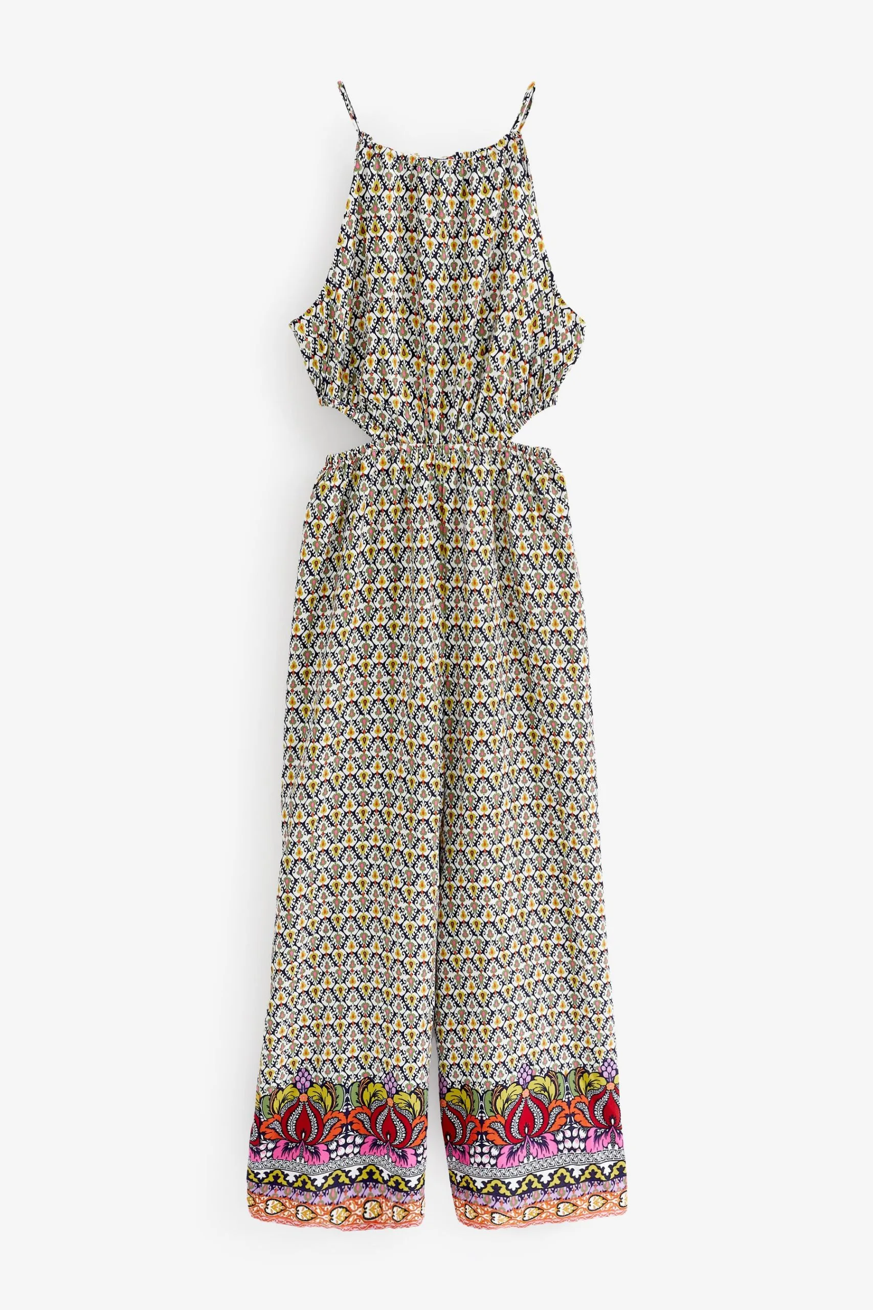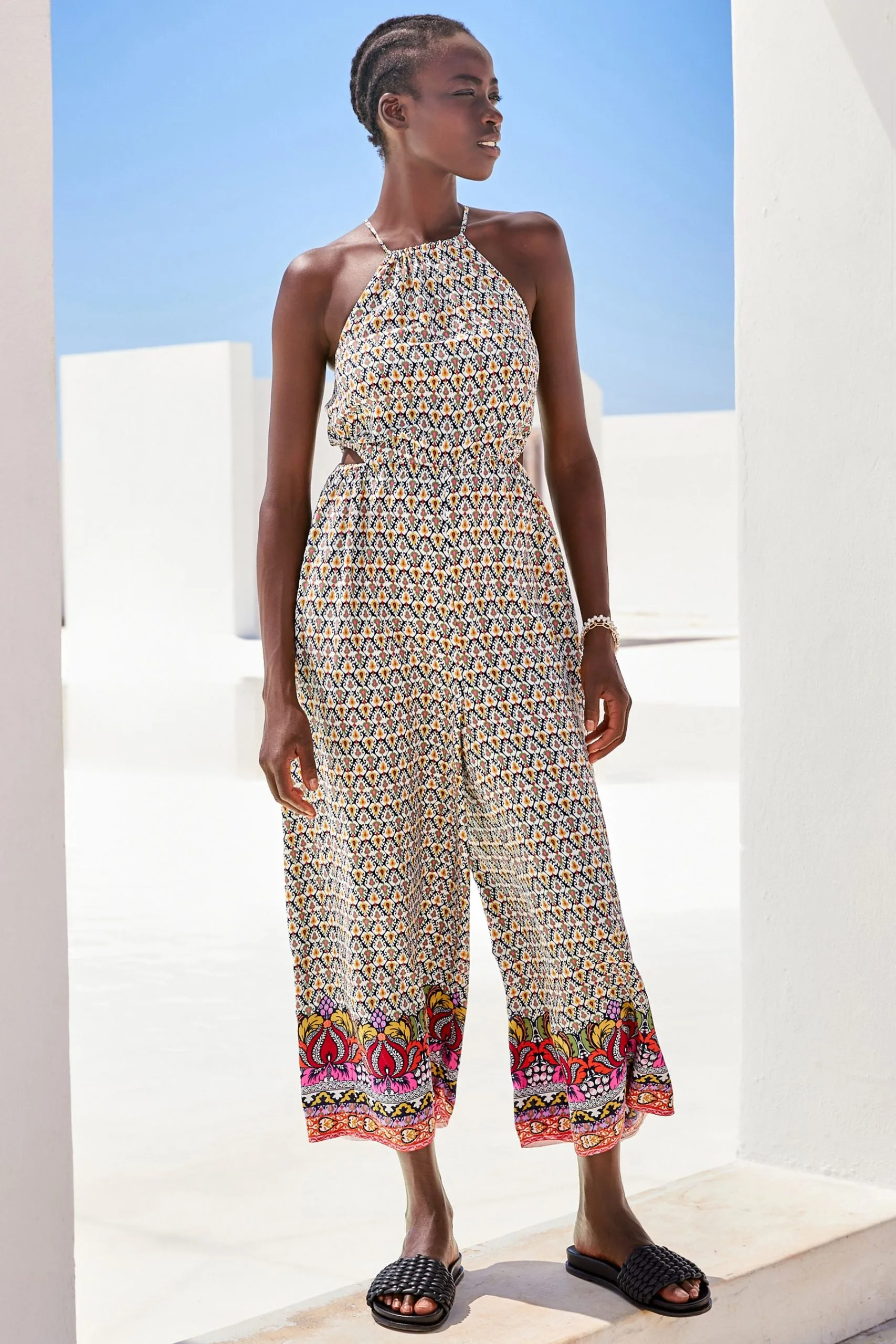 Top of the holiday hotlist is our cut-out jumpsuit. Taking you from beach to bar with ease, this is a style you most definitely want in your suitcase. Made in a soft and silky yet cool and comfortable viscose fabric. The jumpsuit is designed with halterneck spaghetti straps which tie at the back for an adjustable fit, an elasticated waistband with flattering cut-out detailing to the sides and 3/4 length wide-leg trousers.