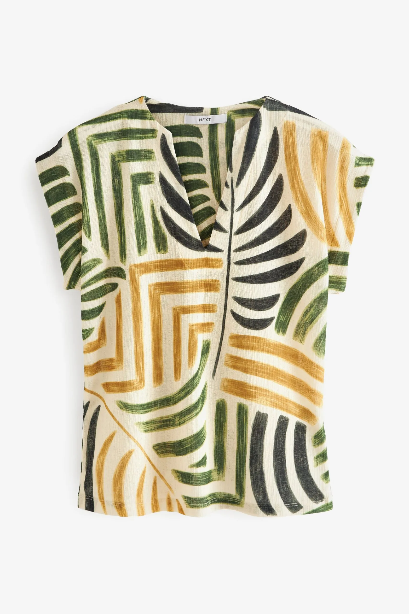 Next Ecru Tropical Print Plisse Notch Neck Top