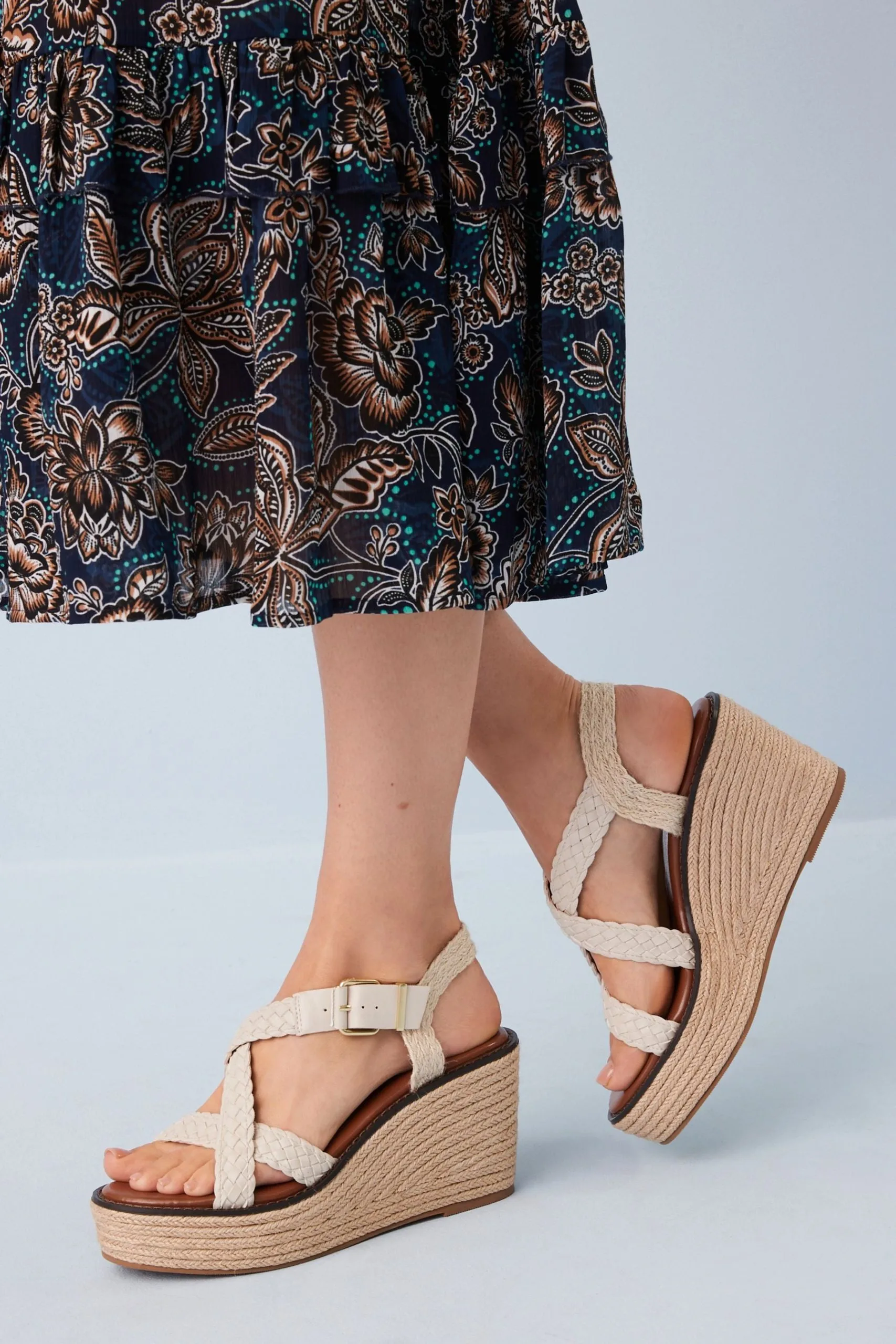 Forever Comfort® padding: with a memory foam layer to help you stay on your feet all day in comfort and style. These wedges have an elasticated cross-over detailing which provides comfort whilst keeping your foot in place. A popular espadrille wedge covering with weave straps and ankle buckle that can take you from day to night.