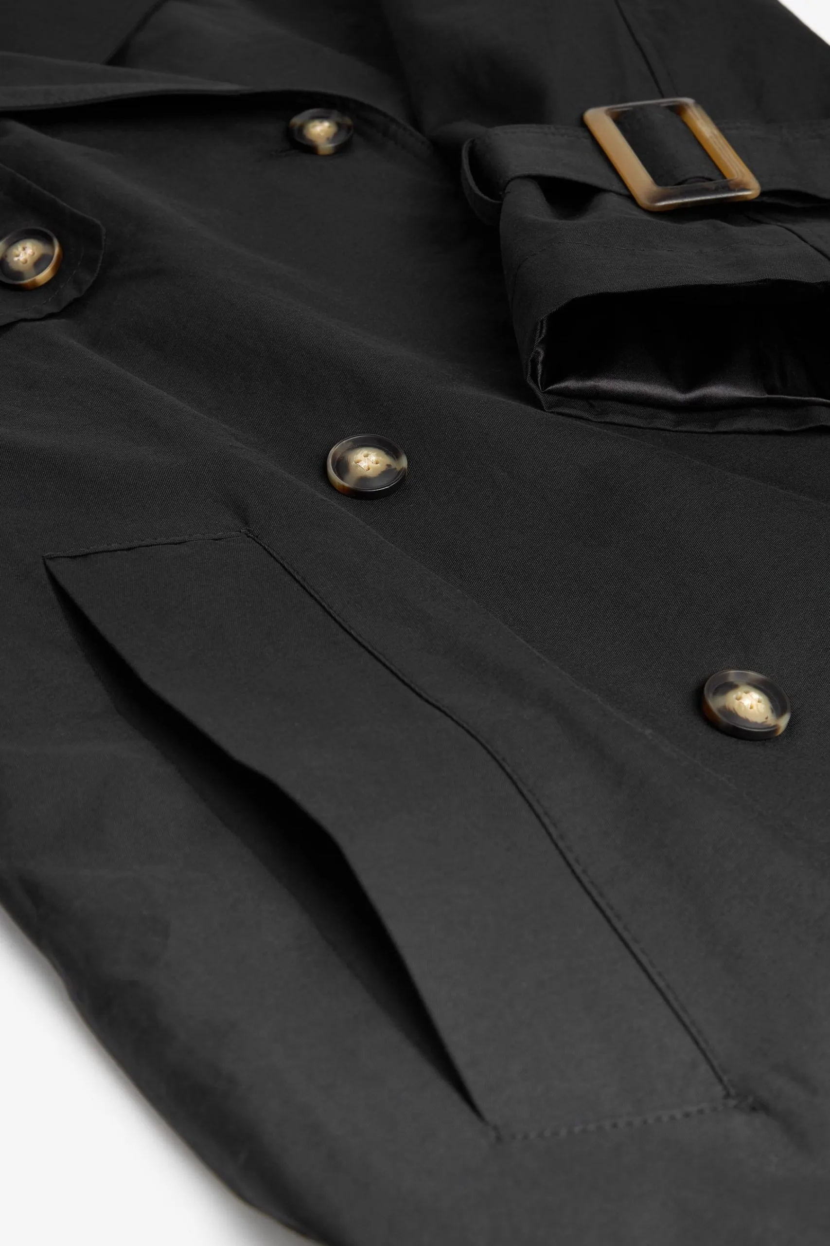 A timeless coat, our classic black trench will take care of the trans-seasonal days when it's too warm for a winter coat and too cold to go coatless. Made from a beautiful cotton and nylon blend and shower resistant, the elegant double-breasted coat features buckled cuffs, button fastenings down the front and a cosy hood for colder days. A tie belt on the waist can be done up or undone to suit your style and this coat lends itself to layering perfectly. We are sure you will enjoy this coat for many years to come.