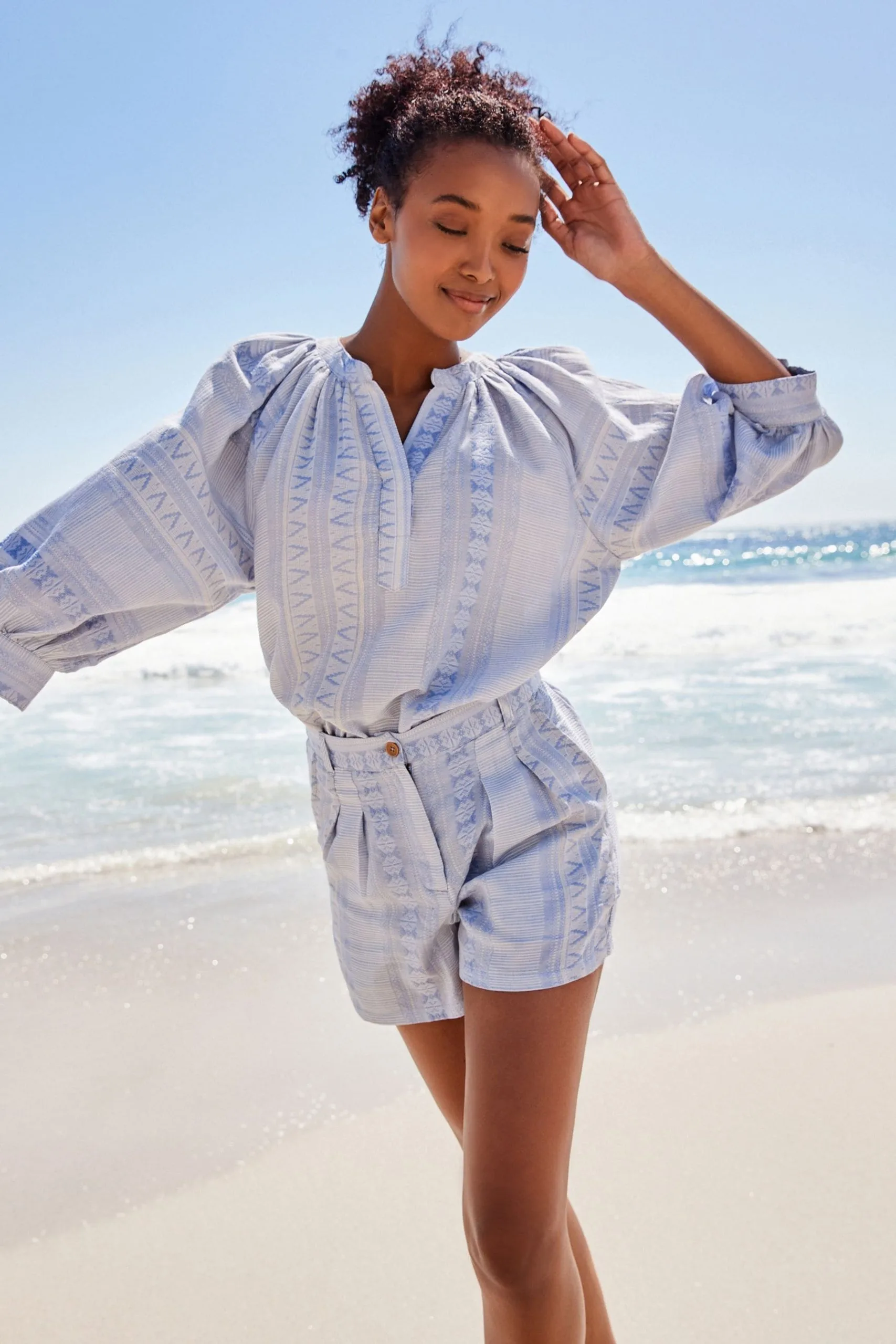 This embroidered kaftan style co-ord top with a V-Neckline featuring a mock placket, delicate ruching details along the neckline, three-quarter sleeves gathered into a cuff, and the dipped hem at the back adds an elevated touch.