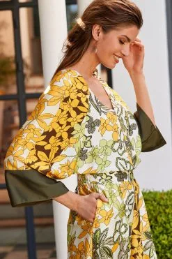 Next Khaki Green/Yellow Satin Printed Long Sleeve Top