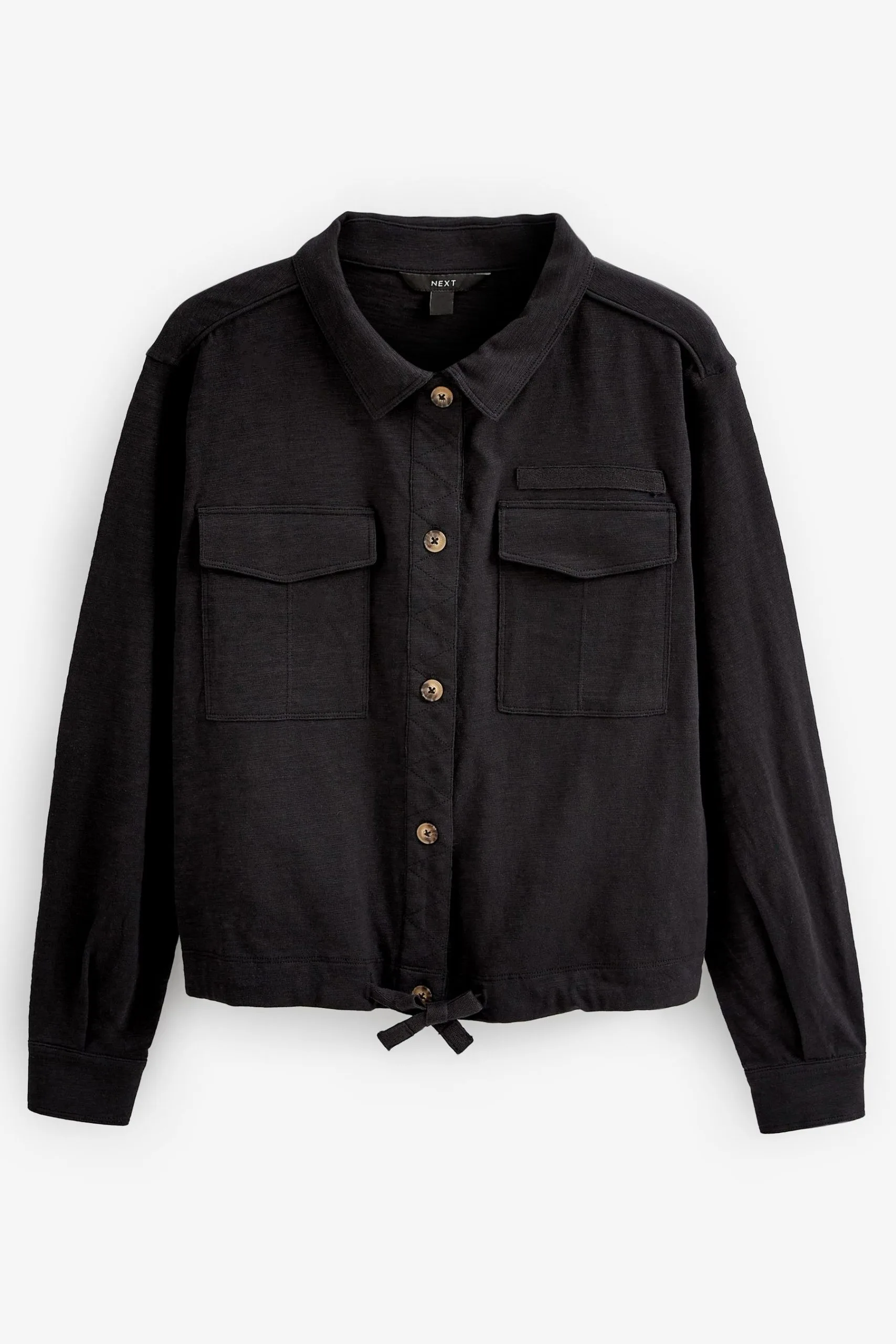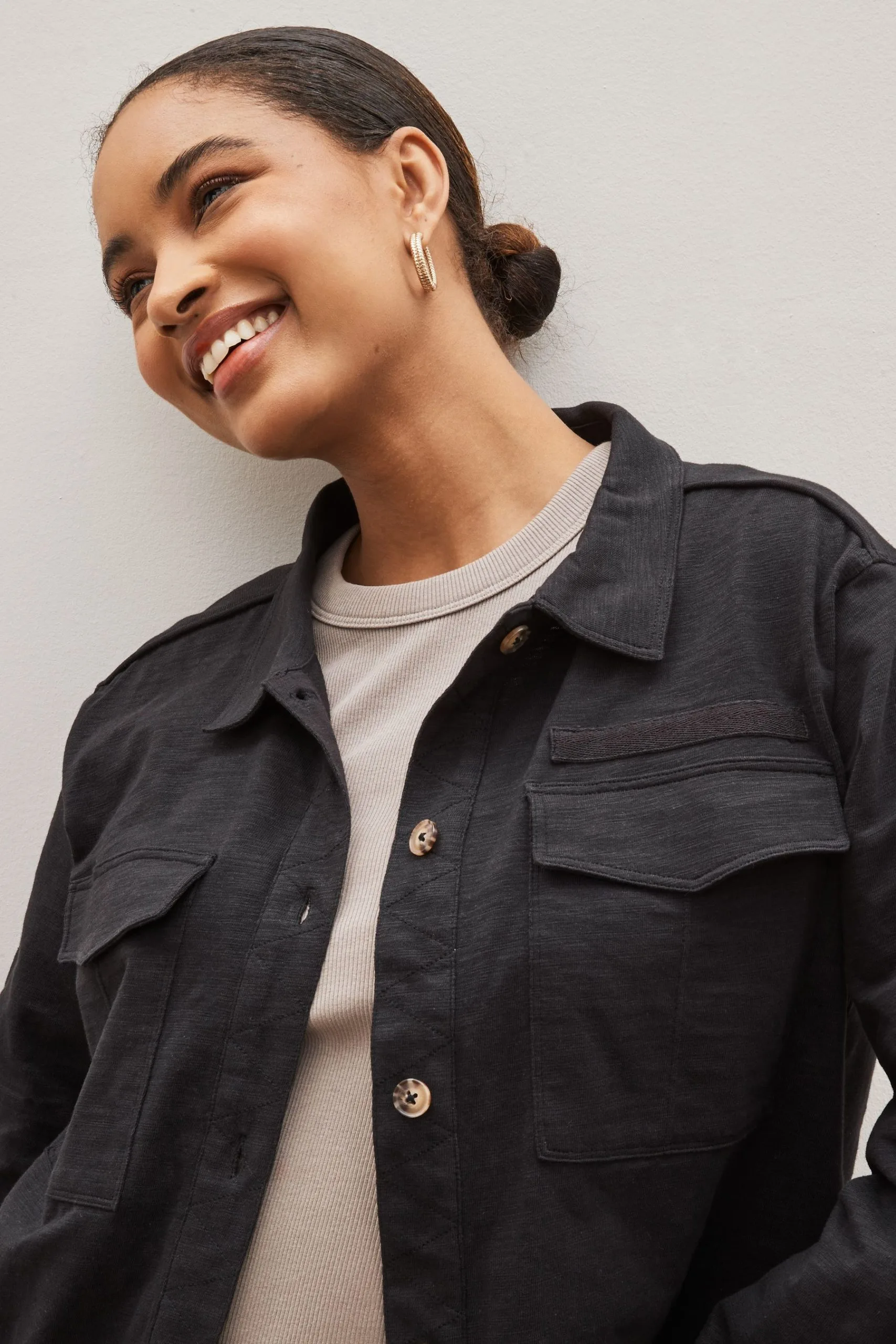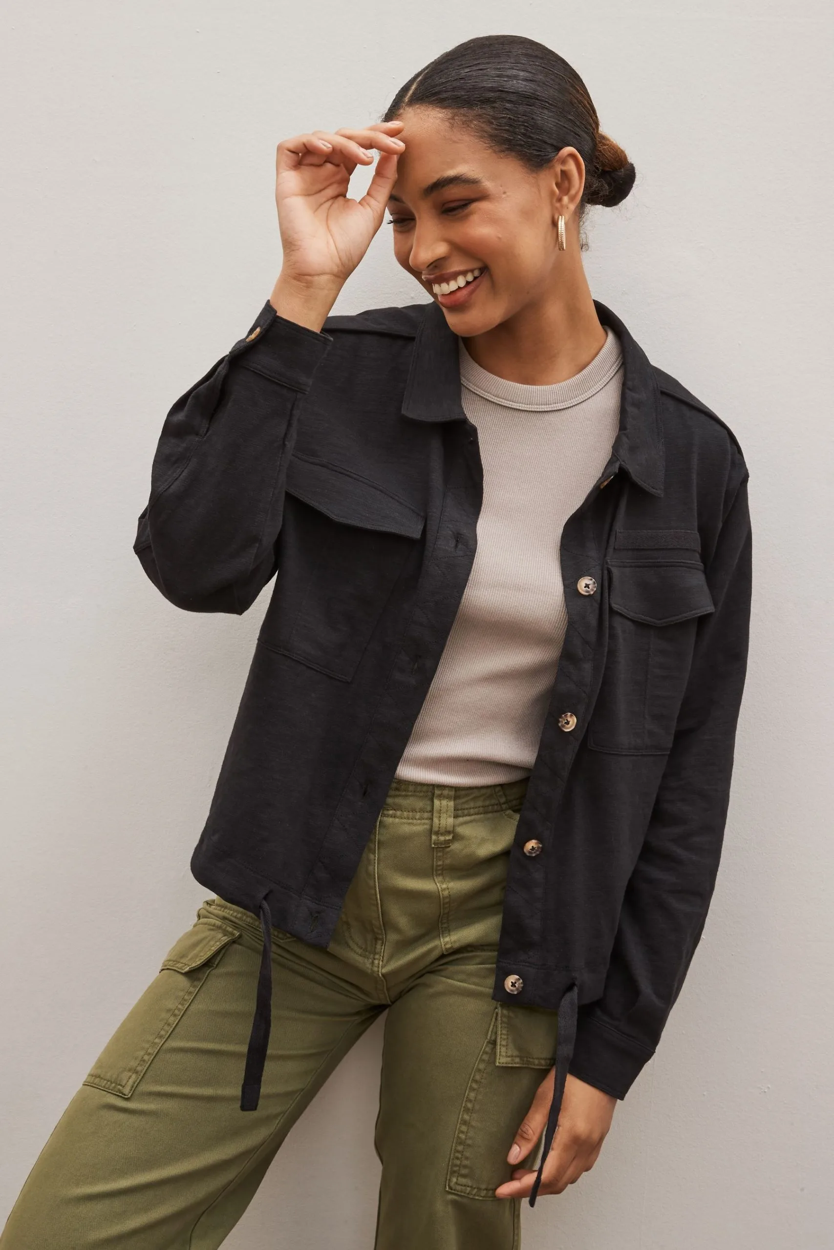 Perfect throw on jacket whether you are running errands or going to work. This jacket is a must have trans seasonal piece. Long sleeves with ribbed hems.