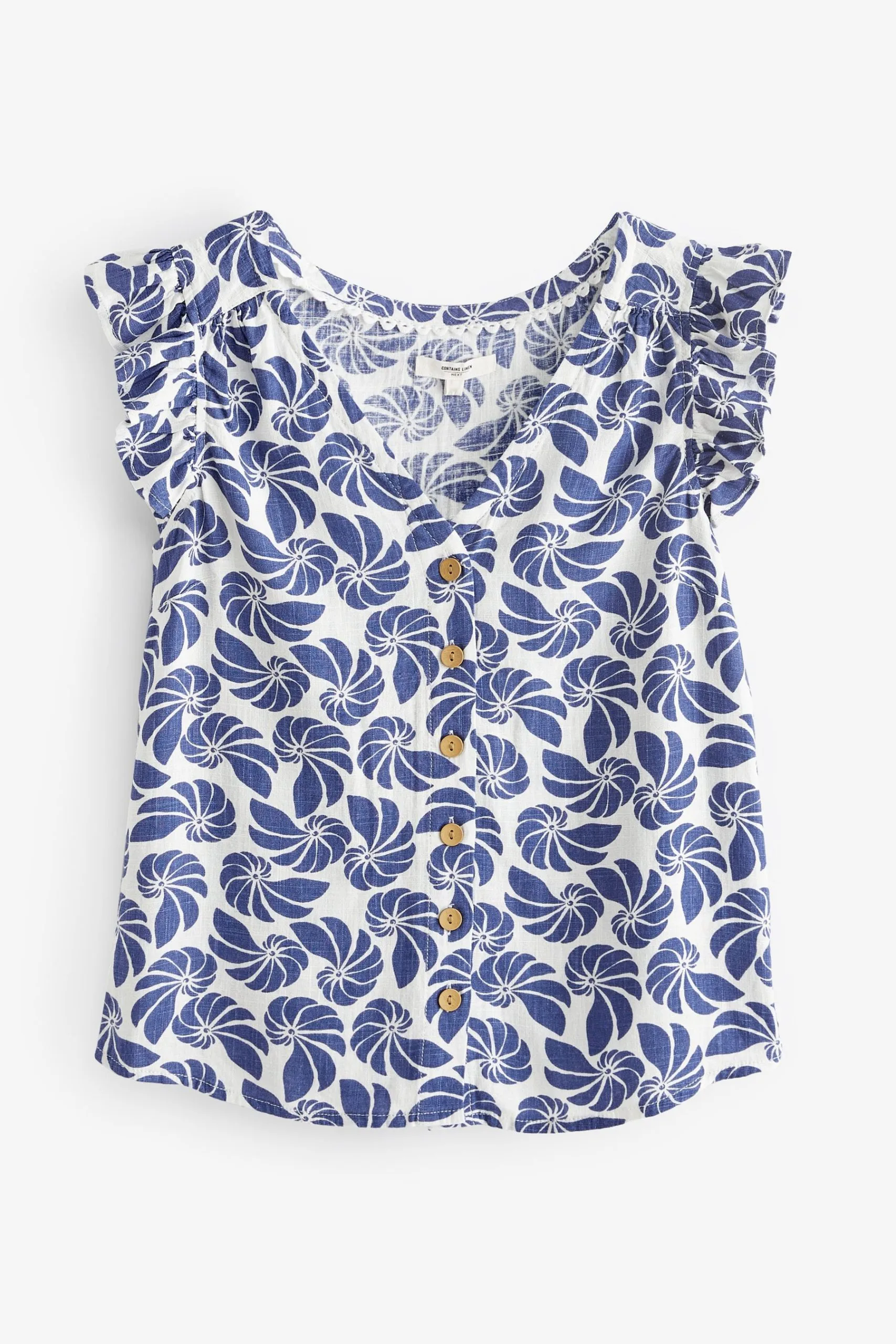 An easy breezy sunshine style, our viscose/linen blend top is sure to be a popular choice in your warm weather rotation. Designed with a V-neck, button through fastening and ruffle shoulder detailing. Team with jeans and sandals for a comfortable casual look.