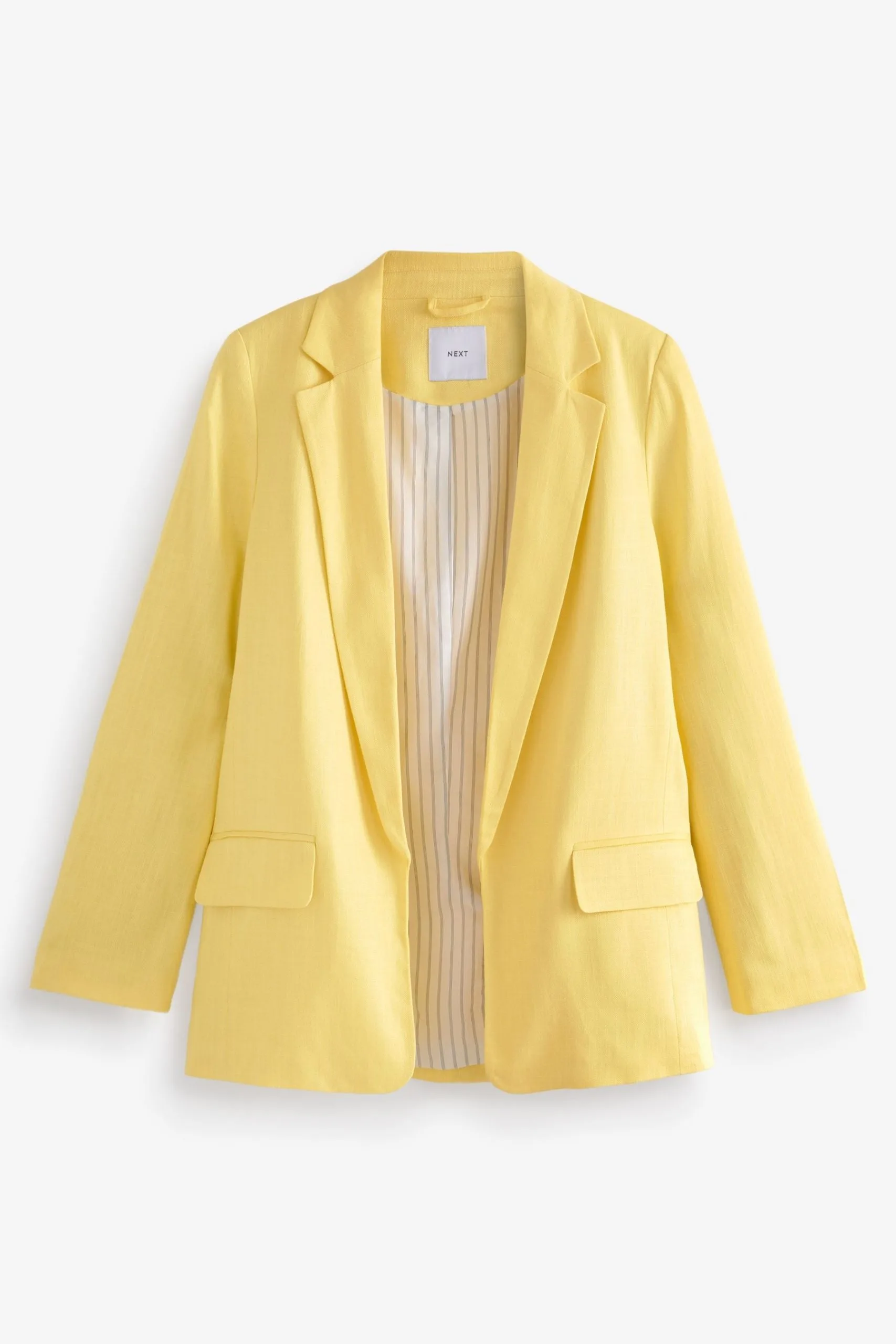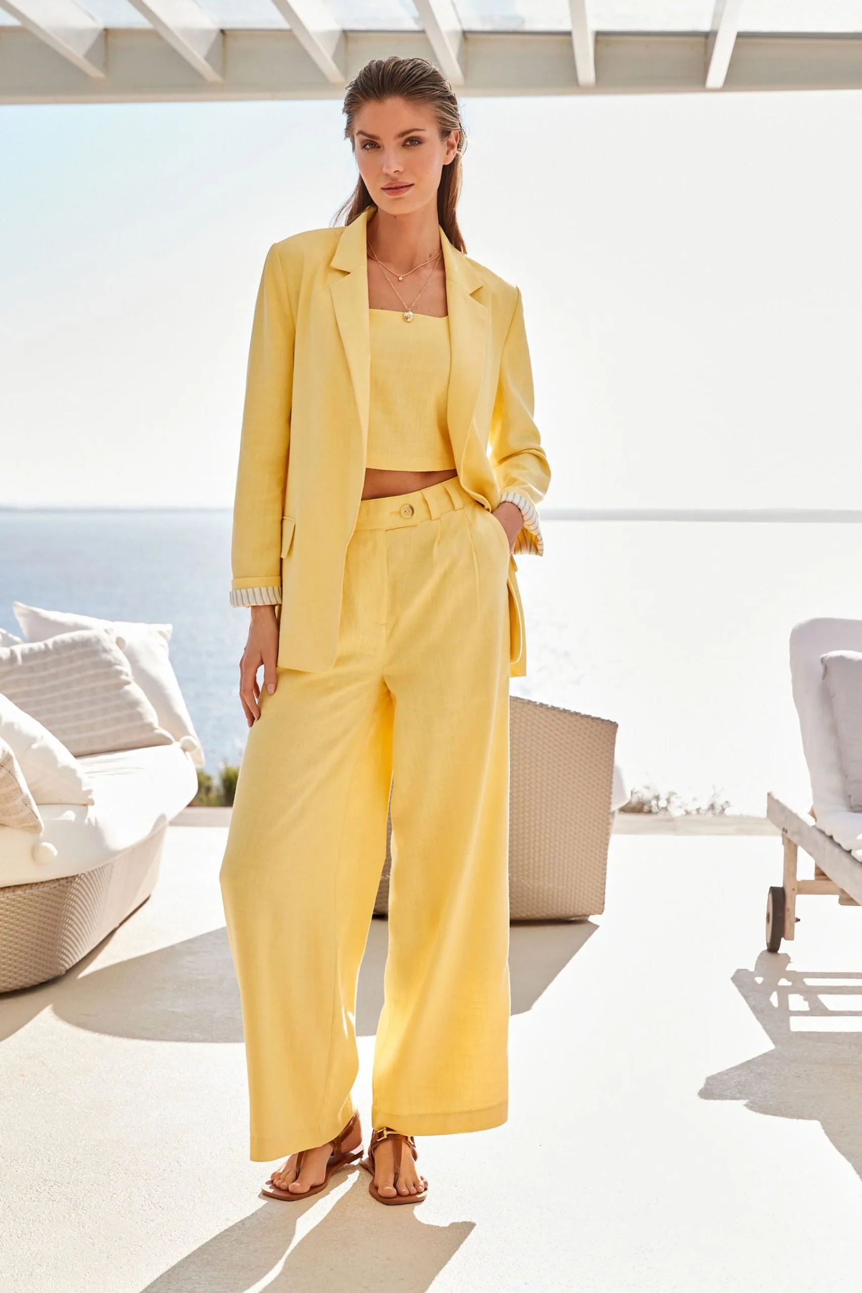 A lightweight single-breasted blazer made from a soft linen blend fabric. Featuring a notched lapel collar and two functional flap pockets on either side of the jacket. A subtle striped lining has been used throughout the blazer, with the option to make this a feature by rolling up the sleeves. Style with the matching wide-leg trousers and cropped top available to complete the look.