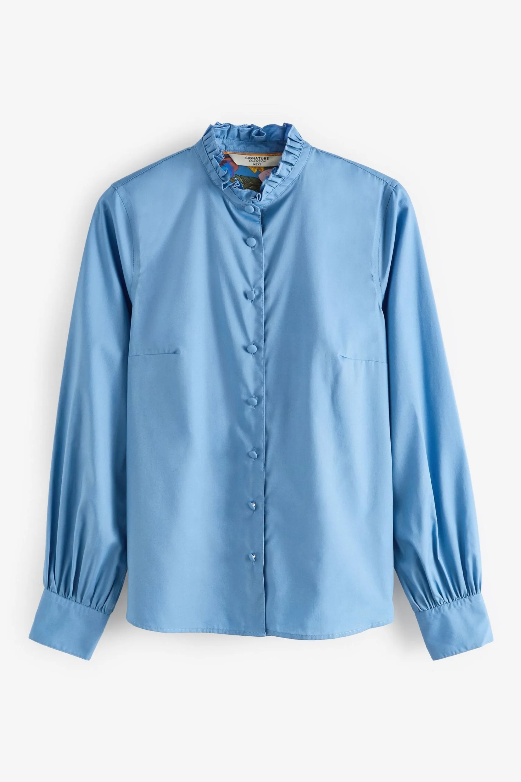 Made from premium super soft cotton with a beautiful drape, this style features a statement ruffle neck, long volume sleeves and contrast cuff linings.