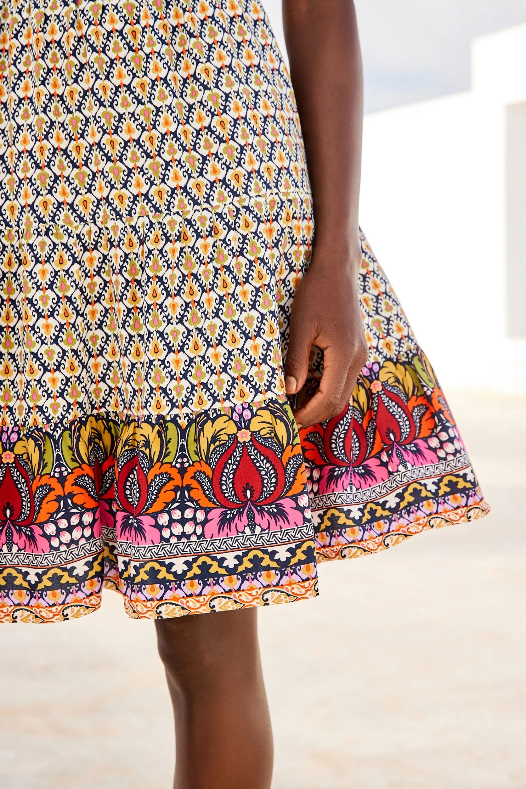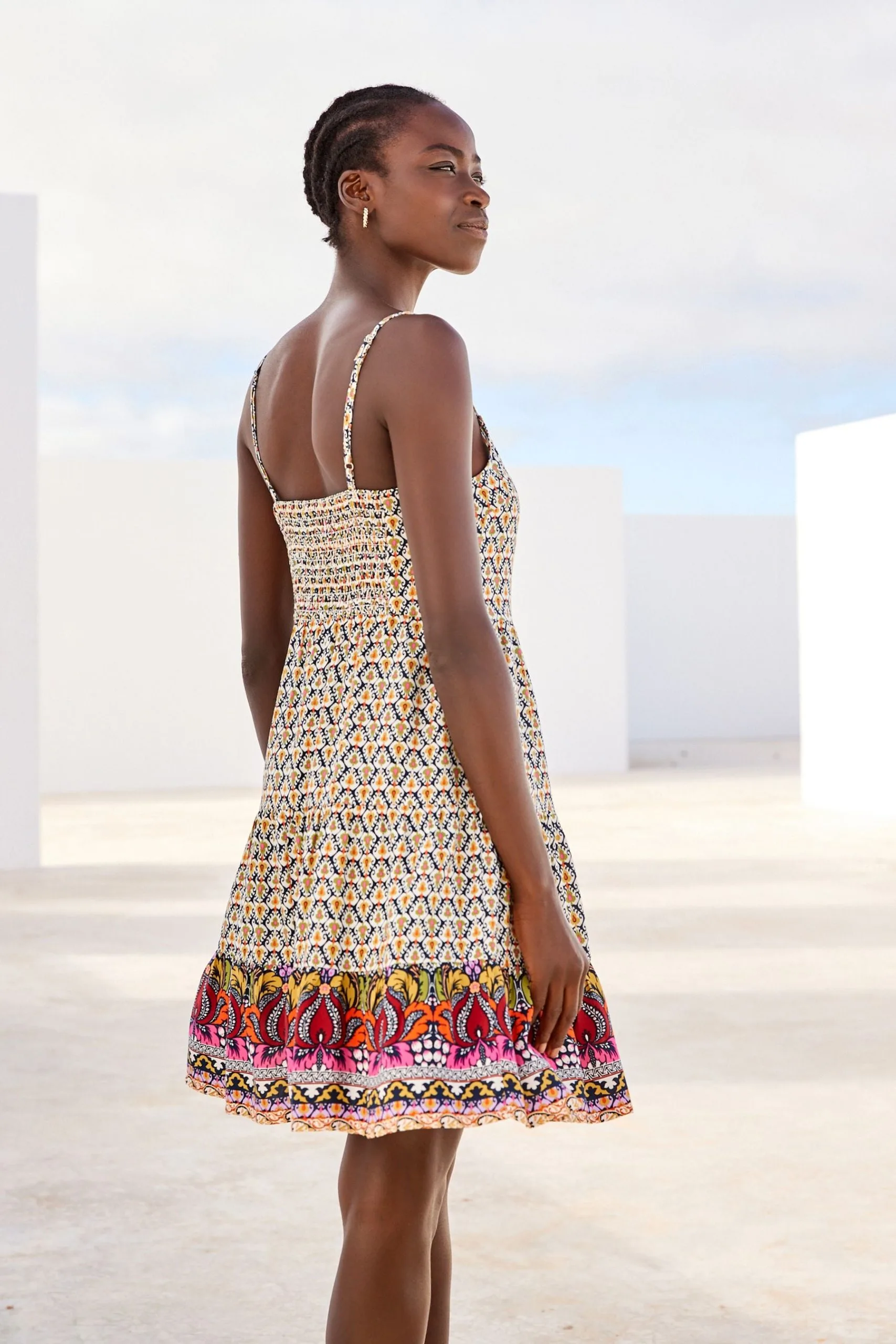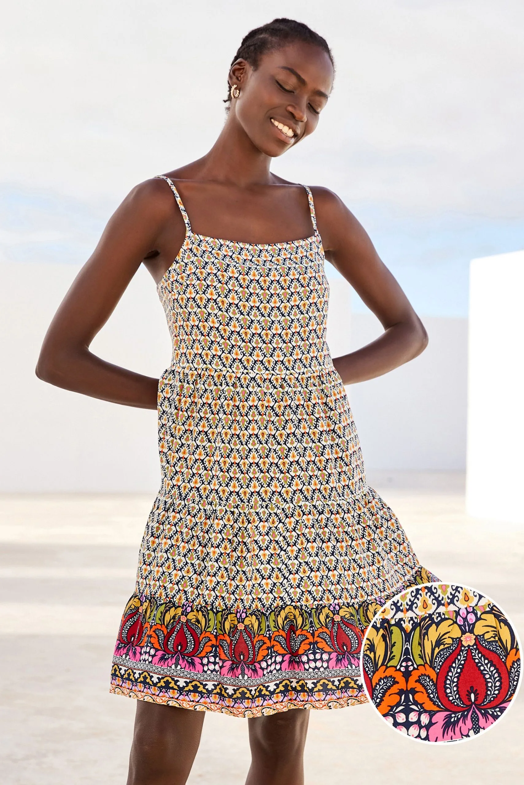 This mini tiered cami dress definitely deserves a spot in your suitcase this summer. Made from a lightweight viscose it is soft, comfortable and stylish. Featuring a square neckline with adjustable spaghetti straps and an elasticated shirred panel to the back to create the perfect fit for you.