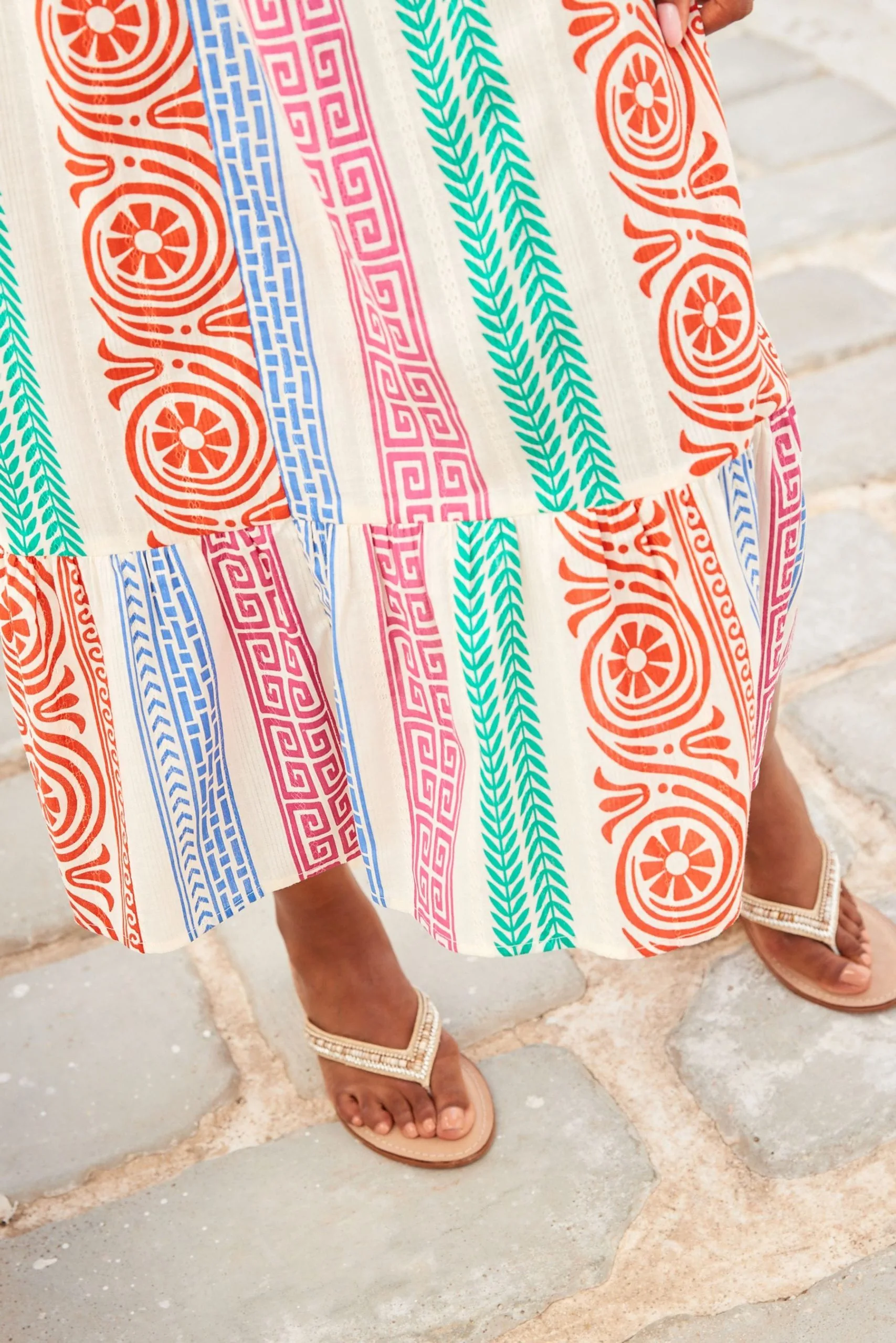 Our multi-stripe bandeaux dress has a touch of Grecian goddess whilst the bandeaux neck gives it a completely contemporary edge. Designed in a midi length with a tiered hem, pair it with your favourite sandals for a suitcase-ready style.