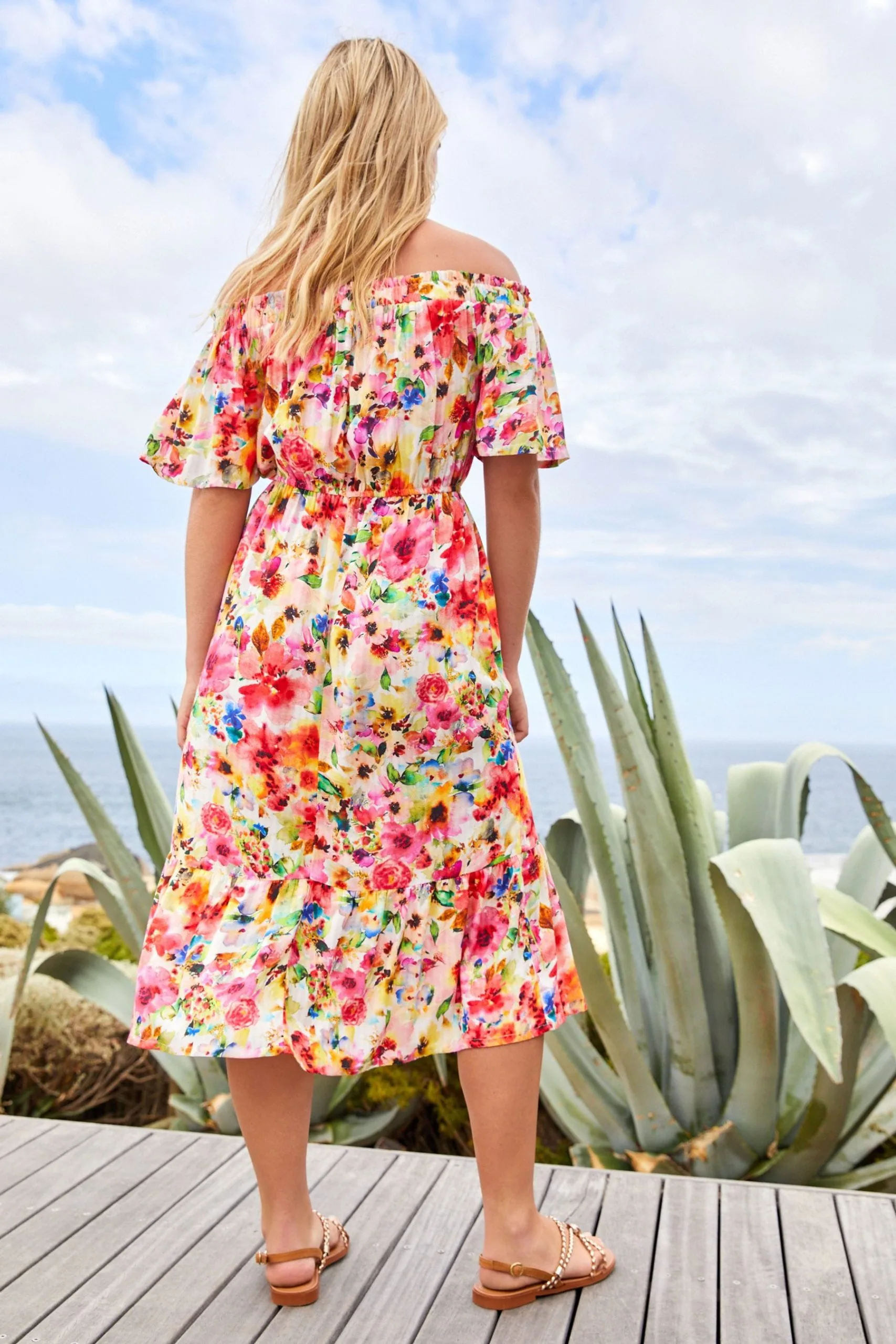 When packing light for a trip away our off the shoulder midi dress is a staple sure to see you through the Summer. With an elasticated neck edge and seamed waist, this is made in a lovely lightweight textured viscose and is available in a range of prints and colours.