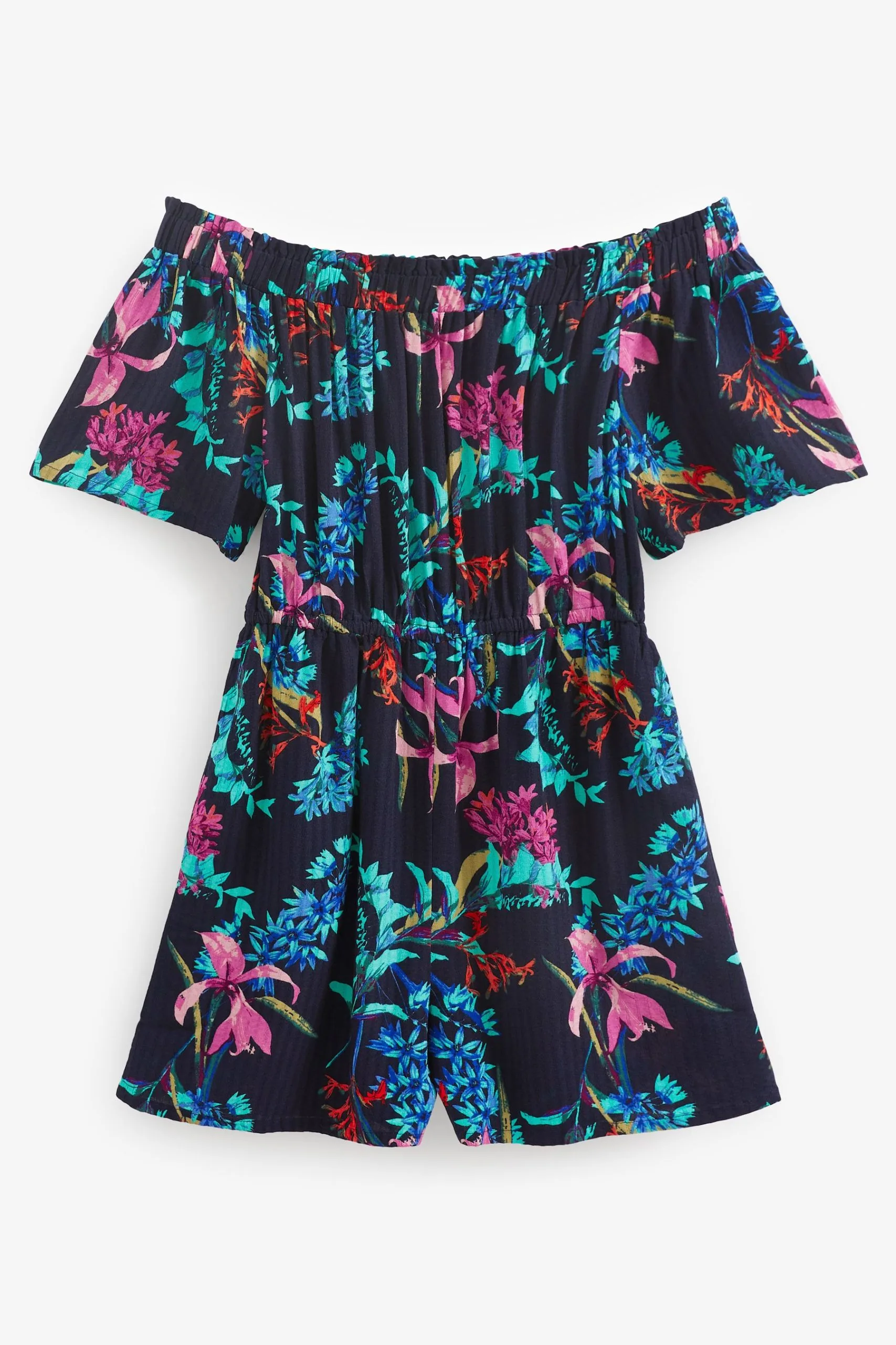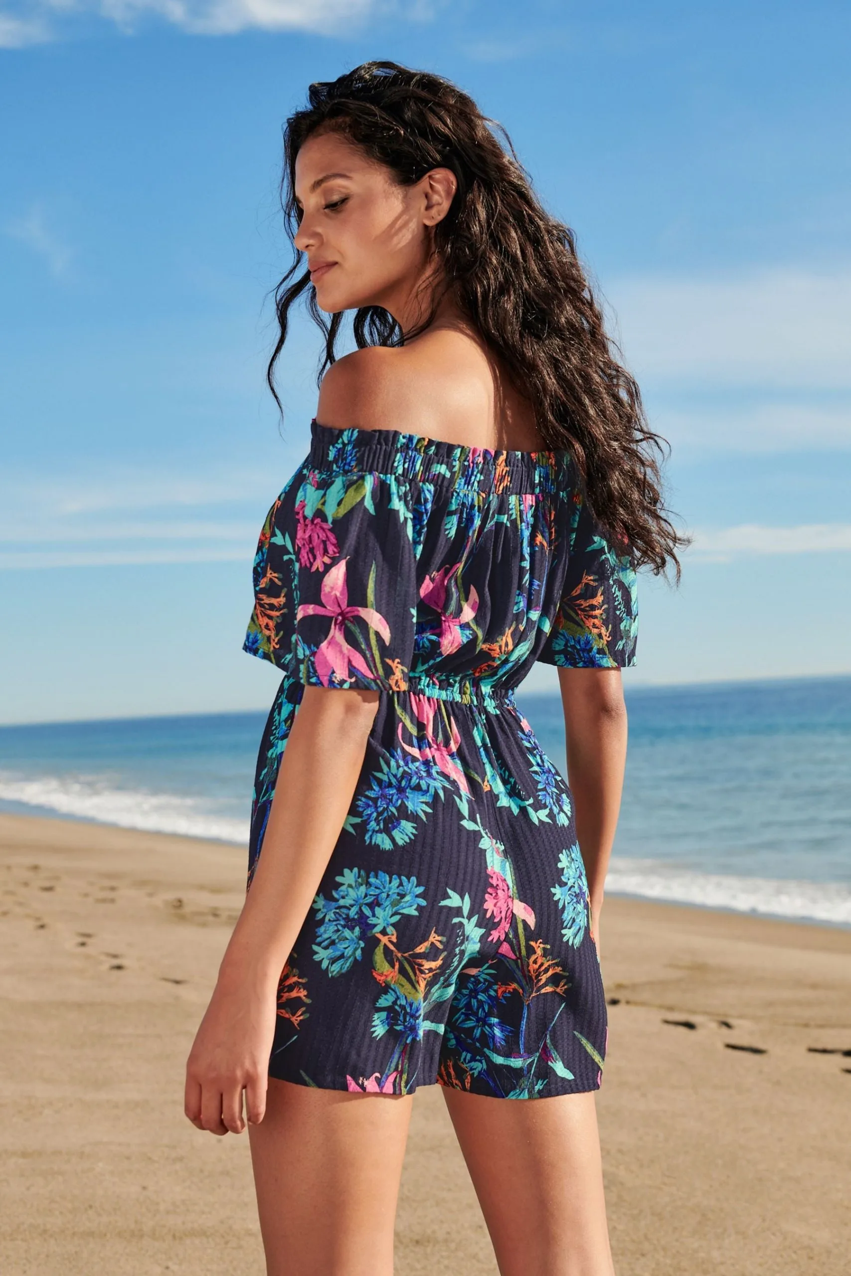 The perfect beach coverup, this fun playsuit offers both style and comfort after a day in the sun. Taking you seamlessly from beach to bar, this printed all-in-one is off the shoulder and decorated all over with a tropical floral print in a rainbow of bright colours on a navy background. Made from a lightweight viscose, our short suit also has a loosely gathered waist to show off your curves.