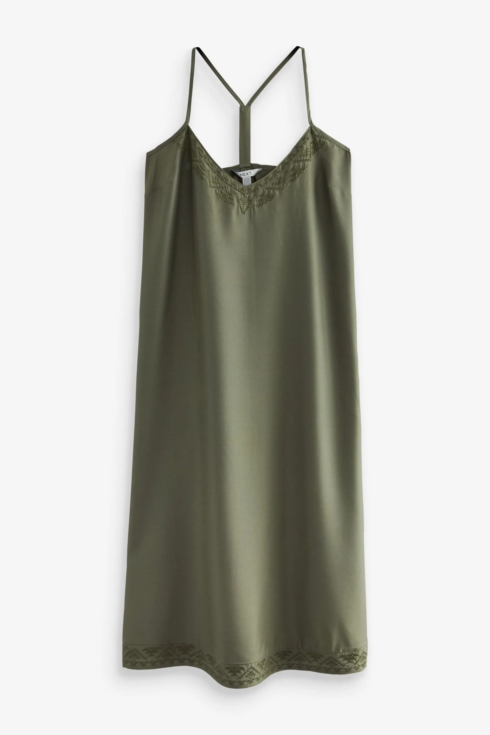 Looking for the perfect dress to slip into? Slip dresses have stood the test of time and have proven themselves as true wardrobe staples and our midi slip dress is no exception. Designed in a floaty fabric with a gentle v-neckline and unique racer-back style straps. Perfect for wearing under an oversize chunky knit or on its own with a dramatic statement heel. This is a dress that goes beyond your ordinary basic and allows you to build your own aesthetic around it. Embrace the trend, but do it your own way.