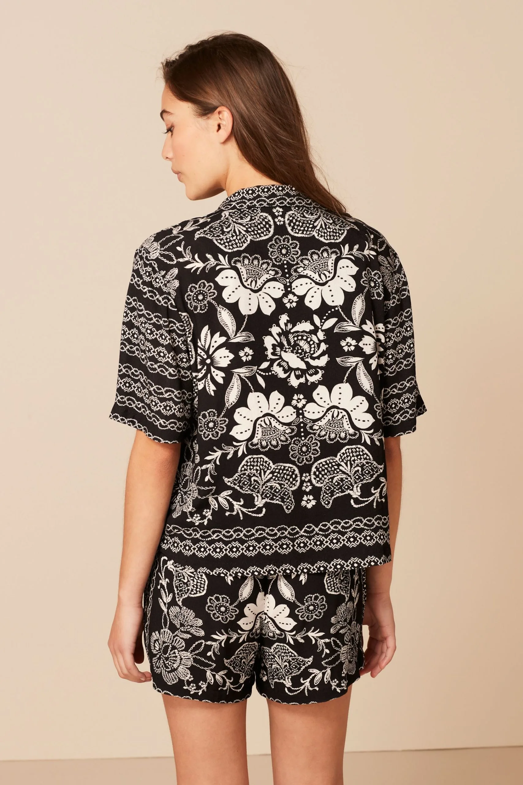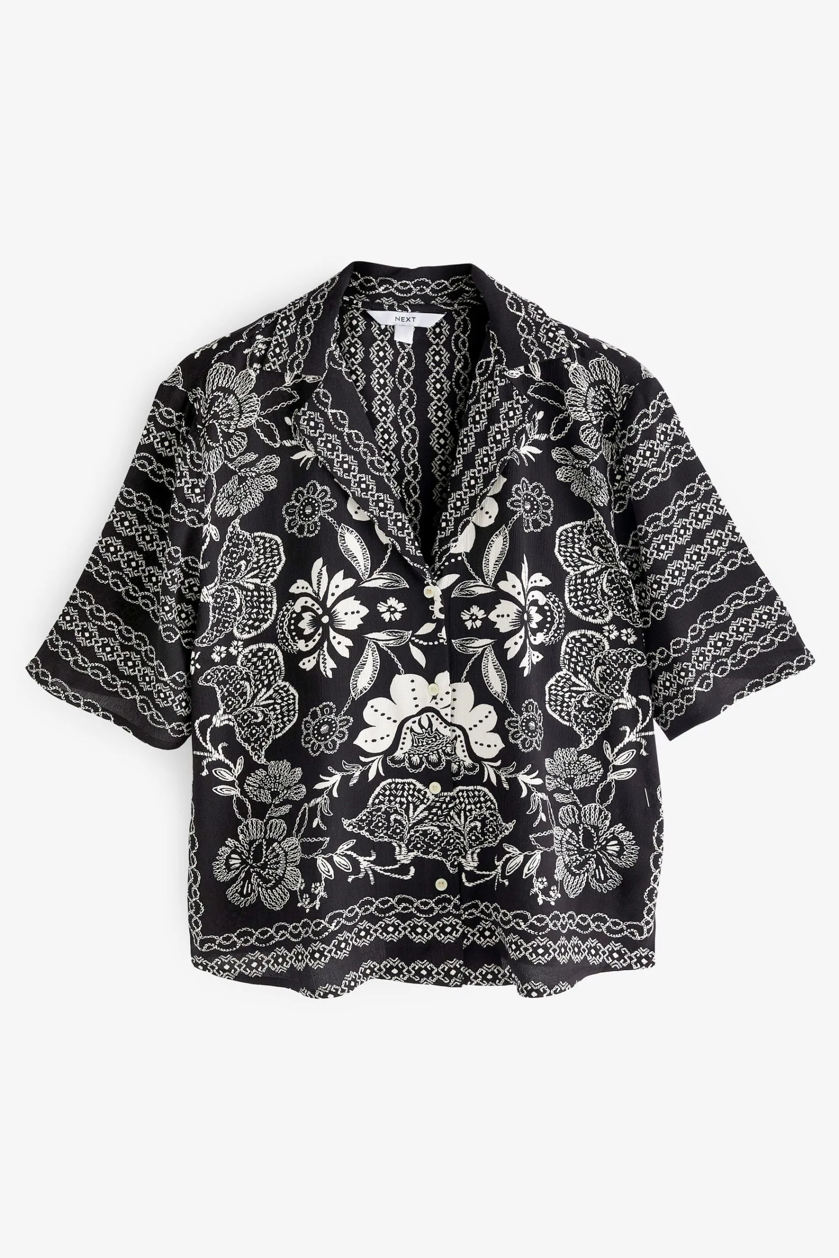 Short sleeve shirt. Floaty, flattering fabric, Revere collar, Contrast cuff, collar and hem, Button-through front fastening, A part of co-ord, wear together or separate.