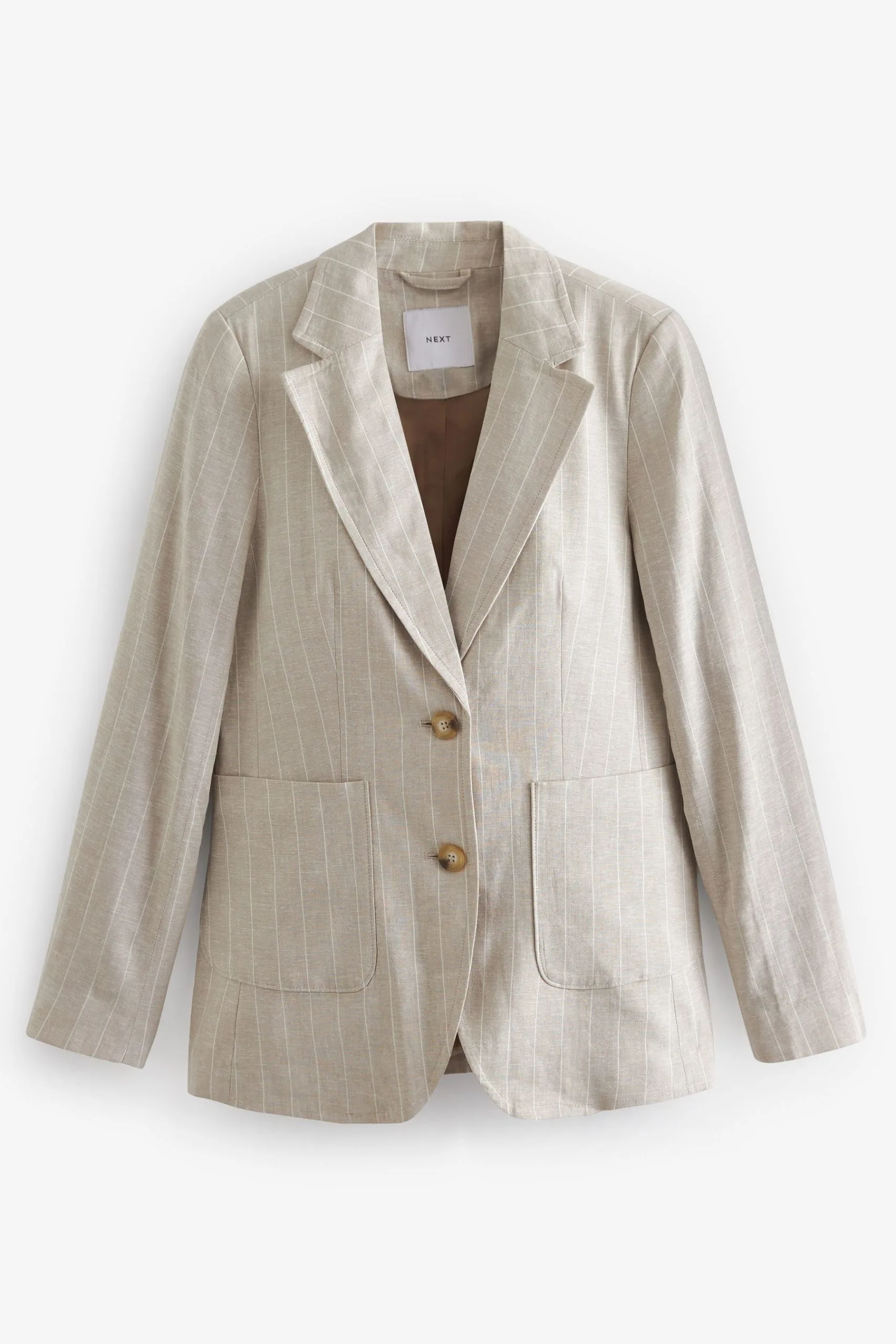 A lightweight single breasted blazer made from a soft linen blend fabric.
