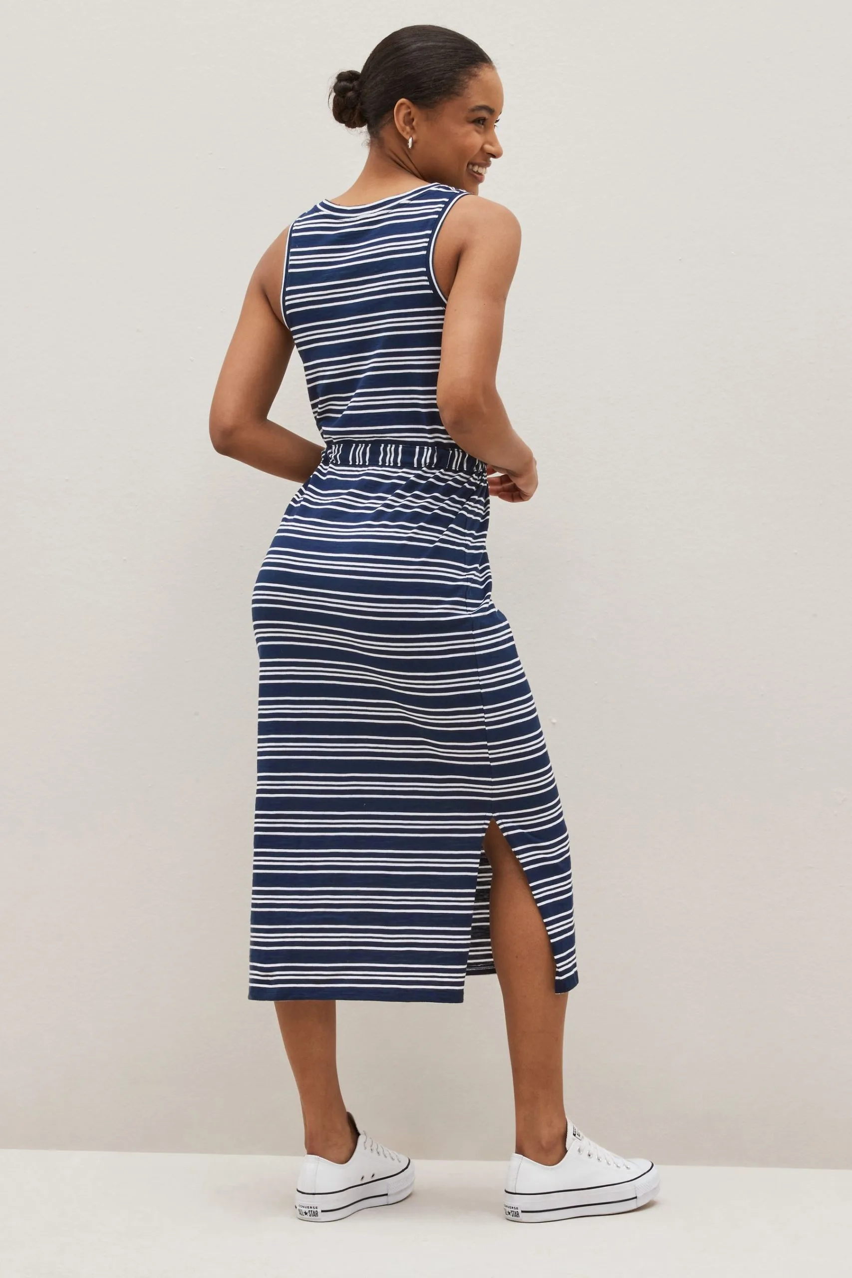 Let us introduce you to your new holiday hero dress. Made from soft and lightweight cotton that is perfect for hot weather days, our elegant blue and white printed sleeveless midi dress also features a v-neck, side slits on the skirt and a fully adjustable drawstring waist tie. Worn over a swimsuit after a day at the beach or with luxe sandals in the evening, this is the ultimate beach to bar dress.