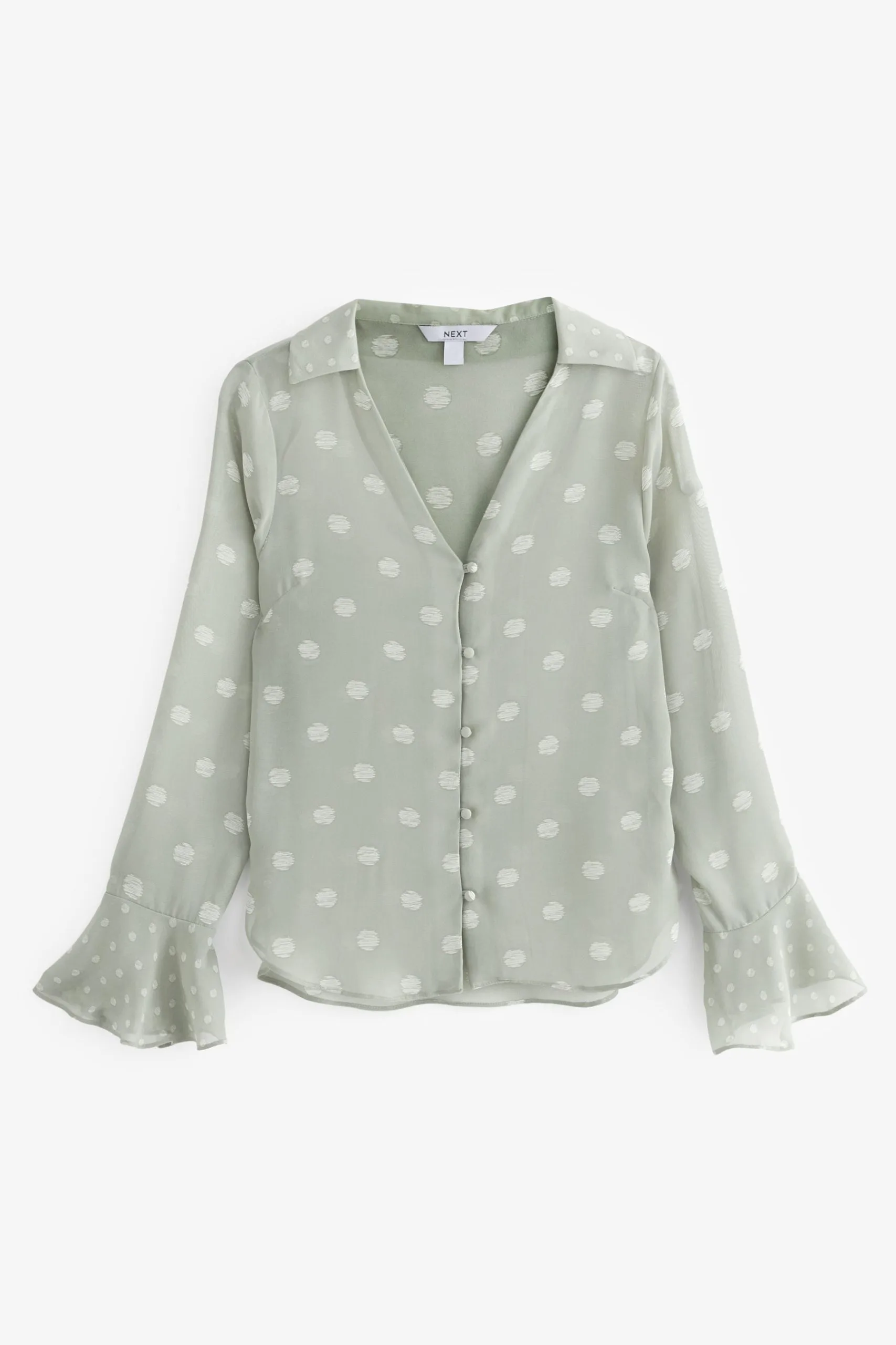 A charming addition to your wardrobe, our pretty sage green spot blouse will add a feminine touch to your look. Made from lightweight polyester, the elegant piece has floaty long sleeves with fabric-covered button fastenings down the front and a flattering V-neck. Team it with trousers and heels for a day at the office or dress it down with jeans and boots on the weekend.